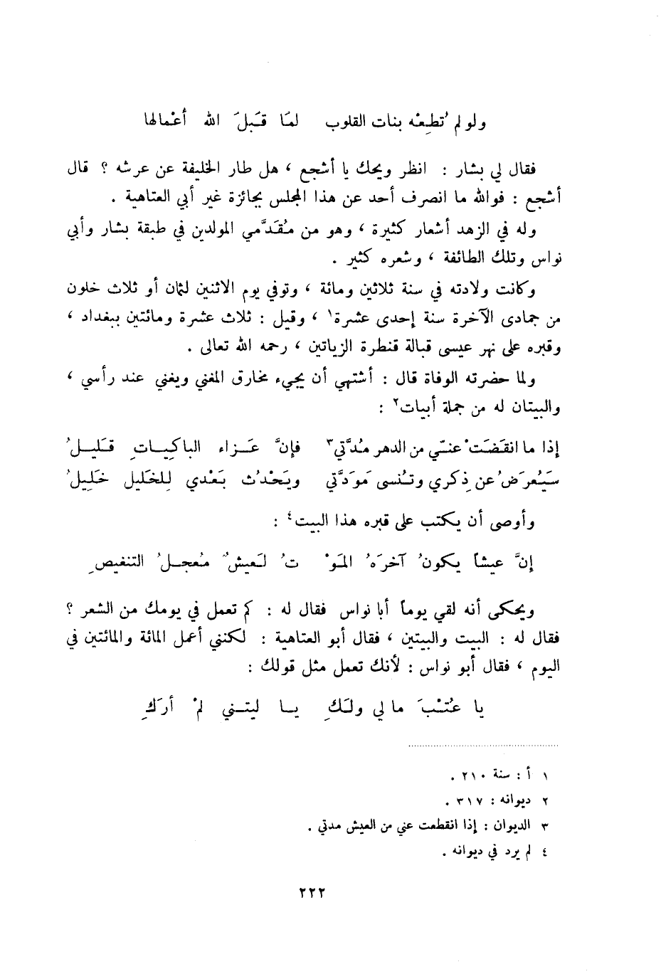 ولما حضرته الوفاة قال: أشتهي أن يجيء مخارق المغني ويغني عند رأسي، والبيتان له من جملة أبيات (2) :