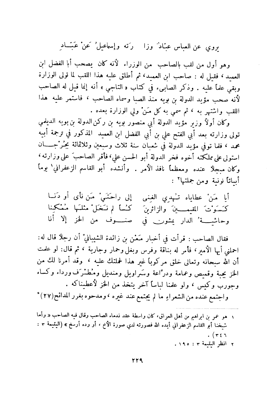 (1) هو عمر بن إبراهيم من أهل العراق، كان واسطة عقد ندماء الصاحب وقال فيه الصاحب " وأما شيخنا أبو القاسم الزعفراني أيده الله فصورته لدي صورة الأخ، أو وده أرسخ " (اليتيمة 3: 346) .