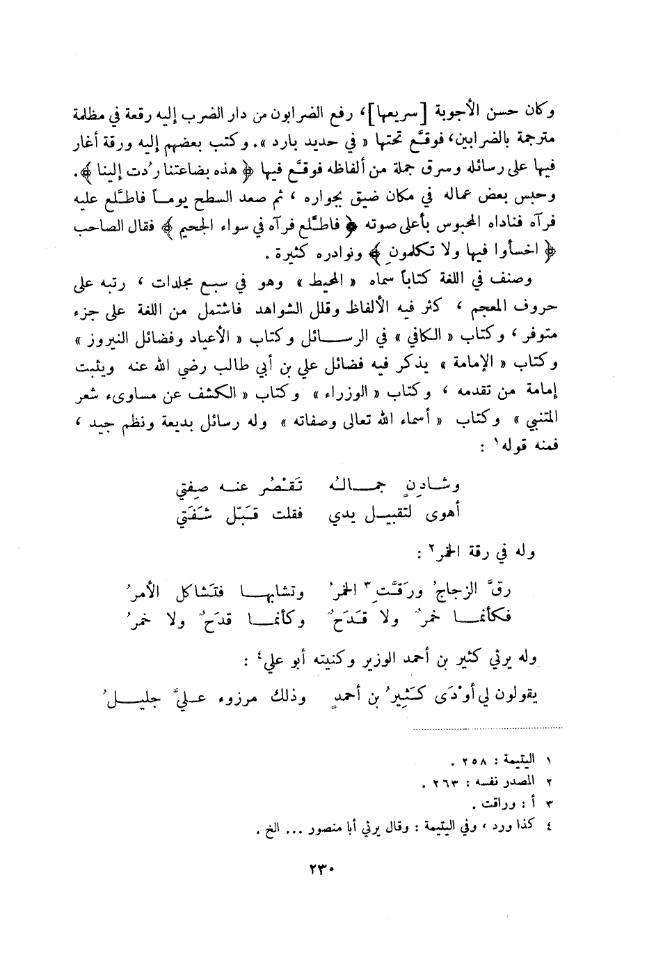 فكأنما خمر ولا قدح ... وكأنما قدح ولا خمر وله يرثي كثير بن أحمد الوزير وكنيته أبو علي (4) :