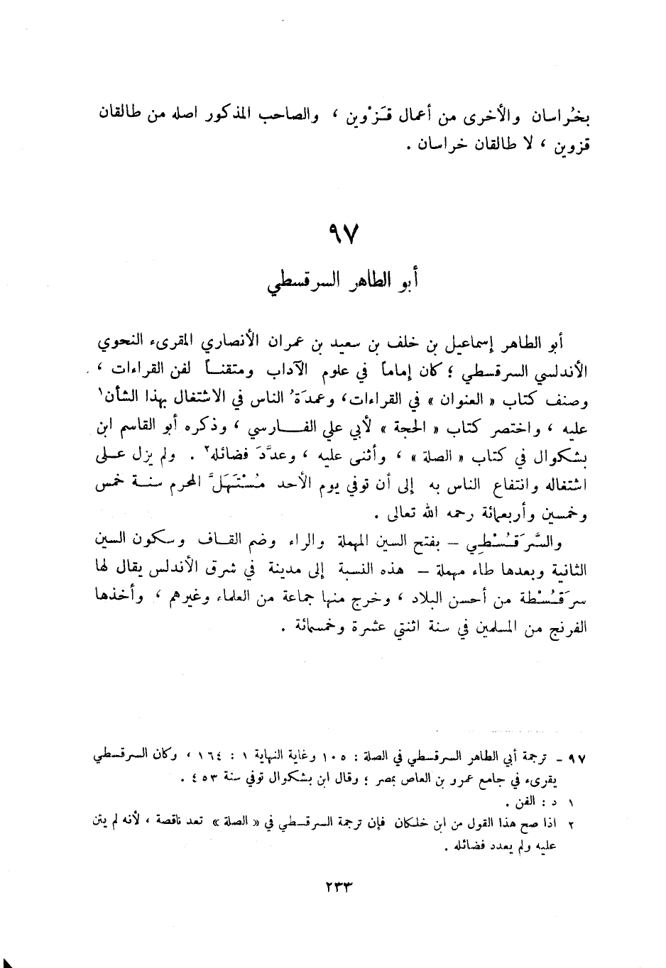 (3) إذا صح القول من ابن خلكان فإن ترجمة السرقسطي في " الصلة " تعد ناقصة، لأنه لم يثن عليه ولم يعدد قضائله.