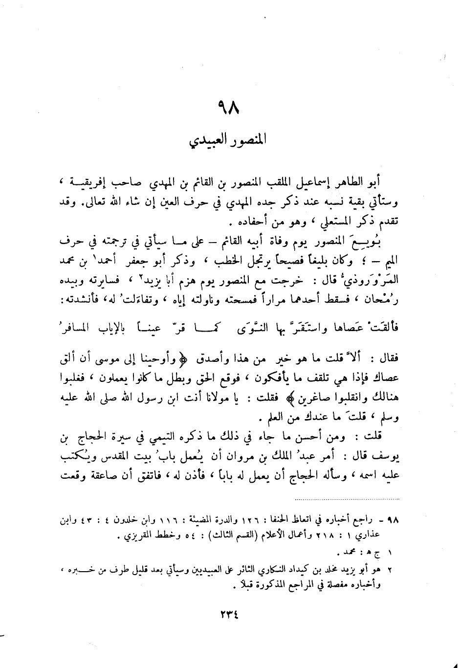بويع المنصور يوم وفاة أبيه القائم - على ما سيأتي في ترجمته في حرف الميم -؛ وكان بليغاً فصيحاً يرتجل الخطب، وذكر أبو جعفر أحمد (2) بن محمد المروروذي قال: خرجت مع المنصور يوم هزم أبا يزيد (3) ، فسايرته وبيده رمحان، فسقط أحدهما مرارا فمسحته وناولته إياه، وتفاءلت له، فأنشدته: