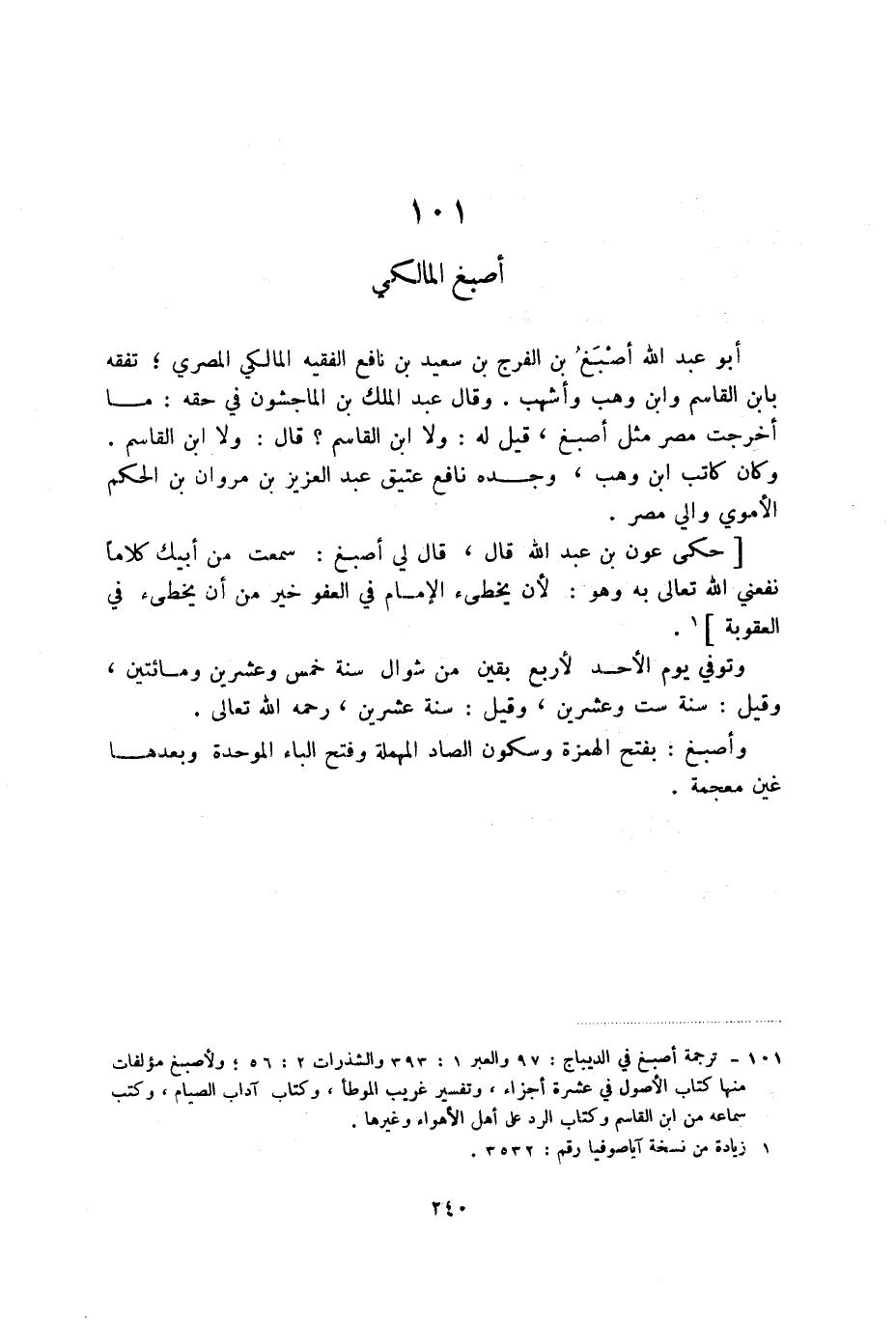 (1) ترجمة أصبغ في الديباج: 97 والعبر 1: 393 والشذرات 2: 56؛ ولأصبغ مؤلفات منها كتاب الأصول في عشرة أجزاء، وتفسير غريب الموطأ، وكتاب آداب الصيام، وكتب سماعه من ابن القاسم وكتاب الرد على أهل الأهواء وغيرها.