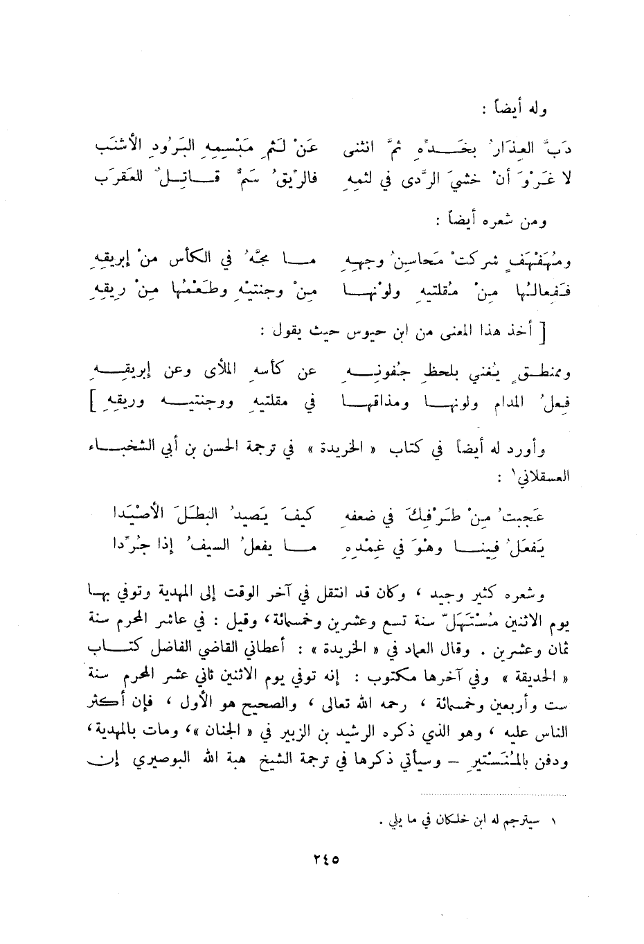 فعل المدام ولونها ومذاقها ... في مقلتيه ووجنتيه وريقه] وأورد له أيضاً في كتاب " الخريدة " في ترجمة الحسن بن أبي الشخباء العسقلاني (1) :