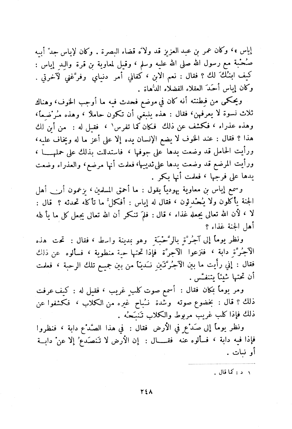 وسمع إياس بن معاوية يهودياً يقول: ما أحمق المسلمين، يزعمون أن أهل الجنة يأكلون ولا يحدثون، فقال له إياس: أفكل ما تأكله تحدثه قال: لا، لأن الله تعالى يجعله غذاء، قال فلم تنكر أن الله تعالى يجعل كل ما يأكله أهل الجنة غذاء