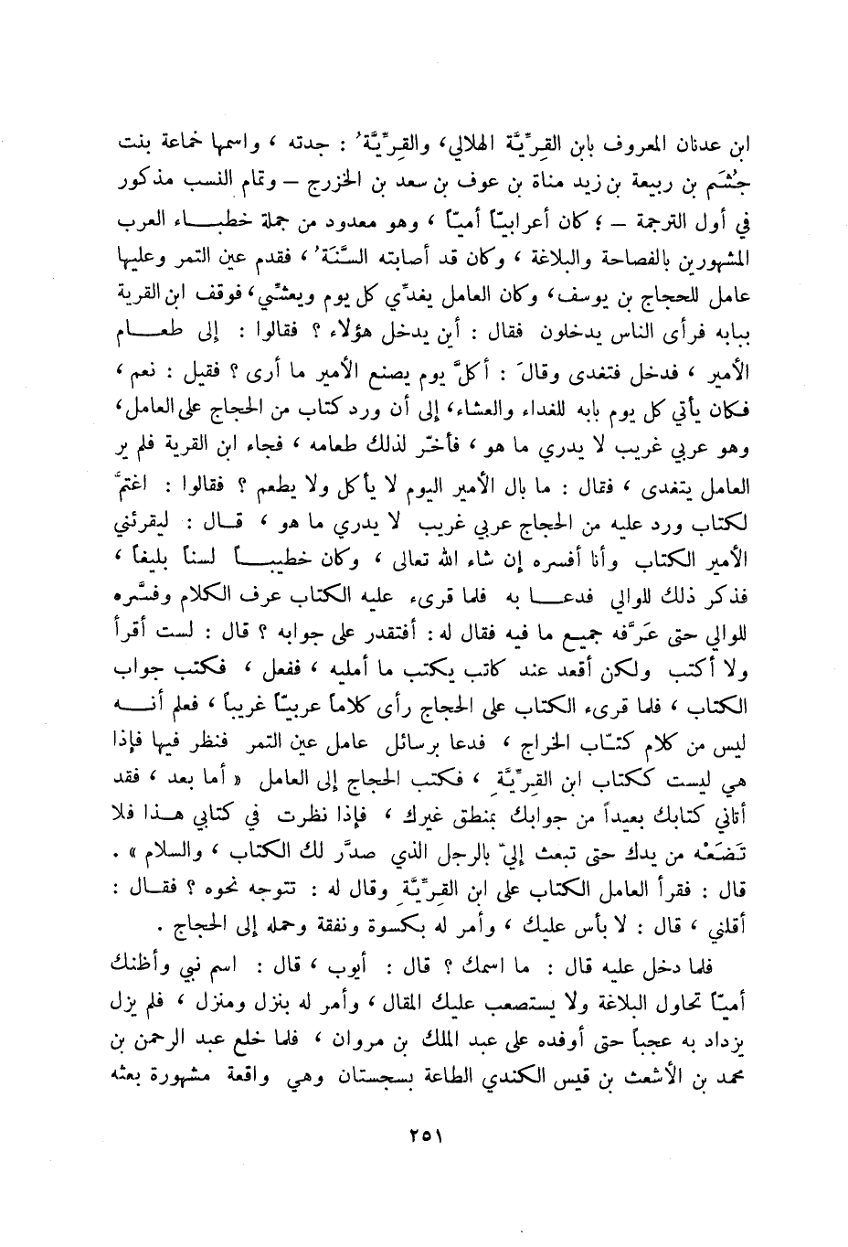 ابن عدنان المعروف بابن القرية الهلالي، والقرية: جدته، واسمها جماعة بنت جشم بن ربيعة بن زيد مناة بن عوف بن سعد بن الخزرج - وتمام النسب مذكور في أول الترجمة؛ كان أعرابياً أمياً، وهو معدود من جملة خطباء العرب المشهورين بالفصاحة والبلاغة، وكان قد أصابته السنة، فقدم عين التمر وعليها عامل للحجاج بن يوسف، وكان العامل يغدي كل يوم ويعشي، فوقف ابن القرية ببابه فرأى الناس يدخلون فقال: أين يدخل هؤلاء فقالوا: إلى طعام الأمير، فدخل فتغدى وقال: أكل يوم يصنع الأمير ما أرى فقيل: نعم، فكان يأتي كل يوم بابه للغداء والعشاء، إلى أن ورد كتاب من الحجاج على العامل، وهو عربي غريب لا يدري ما هو، فأخر لذلك طعامه، فجاء ابن القرية فلم ير العامل يتغدى، فقال: ما بال الأمير اليوم لا يأكل ولا يطعم فقالوا: اغتم لكتاب ورد عليه من الحجاج عربي غريب لا يدري ما هو، قال: ليقرئني الأمير الكتاب وأنا أفسره إن شاء الله تعالى، وكان خطيباً لسناً بليغاً، فذكر ذلك نلوالي فدعا به فلما قرئ عليه الكتاب عرف الكلام وفسره للوالي حتى عرفه جميع ما فيه فقال له: أفتقدر على جوابه قال: لست أقرأ ولا أكتب ولكن أقعد عند كاتب يكتب ما أمليه، ففعل، فكتب جواب الكتاب، فلما قرئ الكتاب على الحجاج رأى كلاما عربيا غريبا، فعلم أنه ليس من كلام كتاب الخراج، فدعا برسائل عامل عين التمر فنظر فيها فإذا هي ليست ككتاب ابن القرية، فكتب الحجاج إلى العامل أما بعد، فقد أتاني كتابك بعيداً من جوابك بمنطق غيرك، فإذا نظرت في كتابي هذا فلا تضعه من يدك حتى تبعث إلي بالرجل الذي صدر لك الكتاب، والسلام. قال: فقرأ العامل الكتاب على ابن القرية وقال له: تتوجه نحوه فقال: أقلني، قال: لا بأس عليك، وأمر له بكسوة ونفقة وحمله إلى الحجاج.