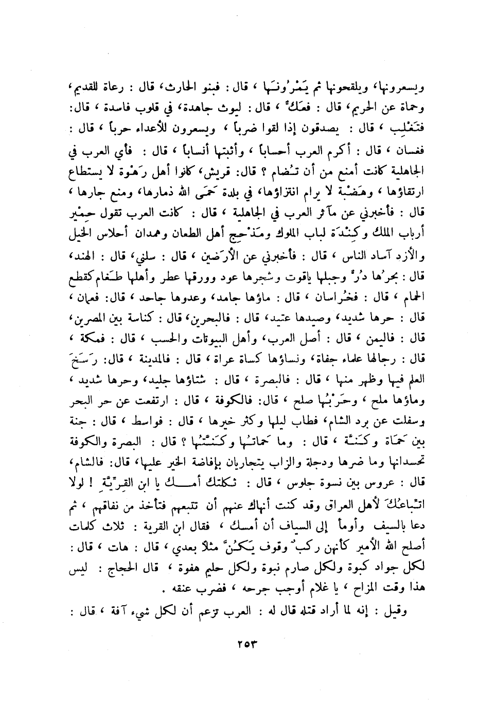 ويسعرونها، ويلقحونها ثم يمرونها، قال: فبنو الحارث، قال: رعاة للقديم، وحماة عن الريم، قال: فعك، قال: ليوث حاهدة، في قلوب فاسدة، قال: فتغلب، قال: يصدقون إذا لقوا ضرباً، ويسعرون للأعداء حراباً، قال: فغسان، قال: أكرم العرب أسحاباً، وأثبتها أنساباً، قال: فأي العرب في الجاهلية كانت أمنع من أن تضام قال: قريش، كانوا أهل رهوة لا يستطاع ارتقاؤها، وهضبة لا يرام انتزاؤها، في بلدة حمس الله ذمارها، ومنع جارها، قال: فأخبرني عن مآثر العرب في الجاهلية، قال: كانت العرب تقول حمير أرباب الملك وكندة لباب الملوك ومذحج أهل الطعان وهمدان أحلاس الخيل والأزد آساد الناس، قال: فأخبرني عن الأرضين، قال: سلني، قال: الهند، قال: بحرها در وجبلها ياقوت وشجرها عود وورقها عطر وأهلها طغام كقطع الحمام، قال: فخراسان، قال: ماؤها جامد، وعدوها جاحد، قال: فعمان، قال: حرها شديد، وصيدها عتيد، قال: فالبحرين، قال: كناسة بين المصرين، قال: فاليمن، قال: أصل العرب، وأهل البيوتات والحسب، قال: فمكة، قال: رجالها علماء جفاة، ونساؤها كساة عراة، قال: فالمدينة، قال: رسخ العلم فيها وظهر منها، قال: فالبصرة، قال: شتاؤها جليد، وحرها شديد، وماؤها ملح، وحربها صلح، قال: فالكوفة، قال: ارتفعت عن حر البحر وسلفت عن برد الشام، فطاب ليلها وكثر خيرها، قال: فواسط، قال: جنة بين حماة وكنة، قال: وما حماتها وكنتها قال: البصرة والكوفة تحسدانها وما ضرها ودجلة والزاب يتجاريان بإفاضة الخير عليها، قال: فالشام، قال: عروس بين نسوة جلوس، قال: ثكلتك أمك يا ابن القرية! لولا اتباعك لأهل العراق وقد كنت أنهاك عنهم أن تتبعهم فتأخذ من نفاقهم، ثم دعا بالسيف وأومأ إلى السياف أن أمسك، فقال ابن القرية: ثلاث كلمات أصلح الله الأمير كأنهن ركب وقوف يكن مثلا بعدي، قال: هات، قال: لكل جواد كبوة ولكل صارم نبوة ولكل حليم هفوة، قال الحجاج: ليس هذا وقت المزاح، ياغلام أوجب جرحه، فضرب عنقه.