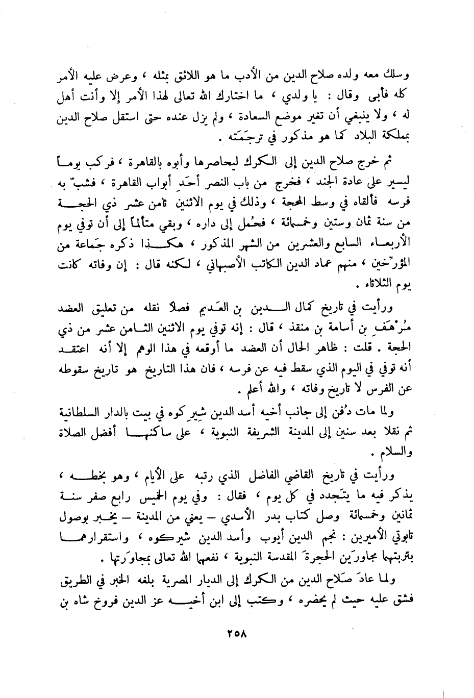 ورأيت في تاريخ كمال الدين بن العديم فصلا نقله من تعليق العضد مرهف بن أسامة بن منقذ، قال: إنه توفي يوم الاثنين الثامن عشر من ذي الحجة. قلت: ظاهر الحال أن العضد ما اوقعه في هذا الوهم إلا أنه اعتقد أنه توفي في اليوم الذي سقط فيه عن فرسه، فان هذا التاريخ هو تاريخ سقوطه عن الفرس لا تاريخ وفاته، والله أعلم.