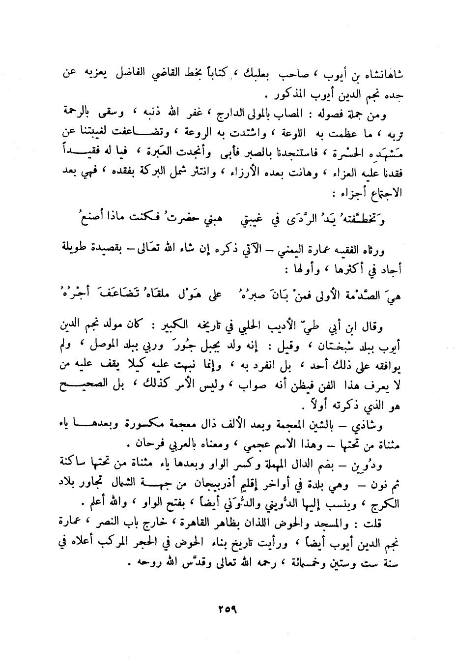 هي الصدمة الأولى فمن بان صبره ... على هول ملقاه تضاعف أجره وقال ابن أبي الطي الأديب الحلبي في تاريخه الكبير: كان مولد نجم الدين أيوب ببلد سجستان، وقيل: إنه ولد بجبل جور وربي ببلد الموصل، ولم يوافقه على ذلك أحد، بل انفرد به، وإنما نبهت عليه كيلا يقف عليه من لا يعرف هذا الفن فيظن أنه صواب، وليس المر كذلك، بل الصحيح هو الذي ذكرته أولا.