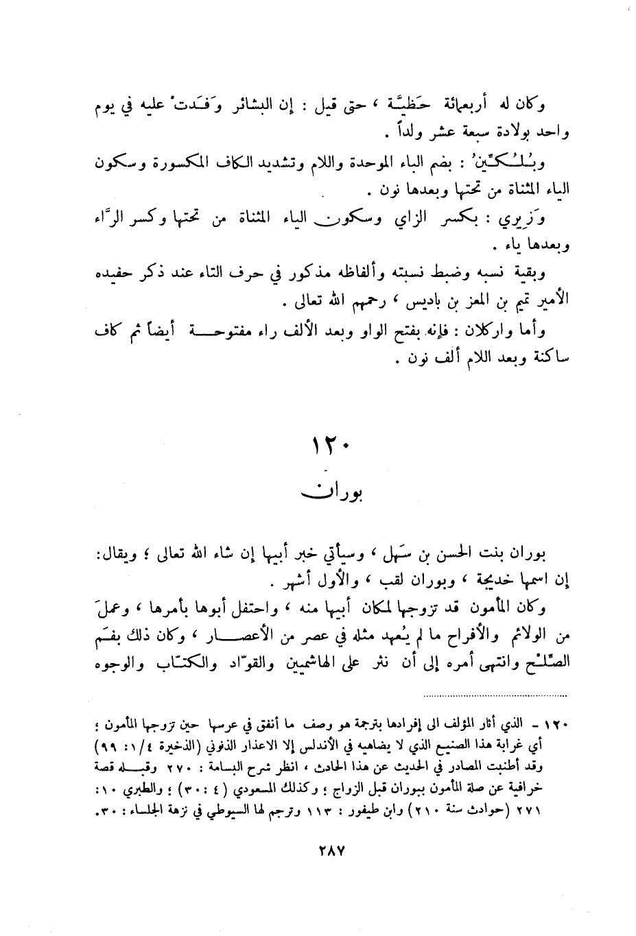 (1) الذي أثار المؤلف إلى إفرادها بترجمة هو وصف ما أنفق في عرسها حين تزوجها المأمون؛ اي غرابة هذا الصنيع الذي لا يضاهيه في الأندلس إلا الأعذار الذنوبي (الذخيرة 1/4: 99) وقد أطنبت المصادر في الحديث عن هذا الحادث، انظر شرح البسامة: 270 وقبله قصة خرافية عن صلة المأمون ببوران قبل الزواج؛ وكذلك المسعودي (4: 30) ؛ والطبري 10: 271 (حوادث سنة 210) وابن طيفور: 113 وترجم لها السيوطي في نزهة الجلساء: 30.