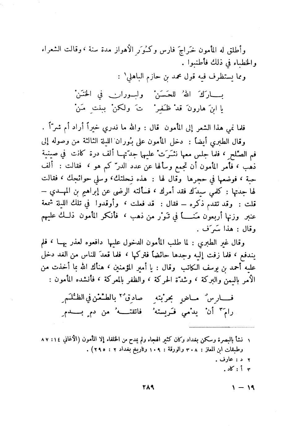 وقال غير الطبري: لما طب المأمون الدخول عليها دافعوه لعذؤر بها، فلم يندفع، فلما زفت إليه وجدها حائضا فتركها، فلما قعد للناس من الغد دخل عليه أحمد بن يوسف الكاتب وقال: يا أمير المؤمنين، هناك الله بما أخذت من الأمر باليمن والبركة، وشدة الحركة، والظفر بالمعركة، فأنشده المأمون: