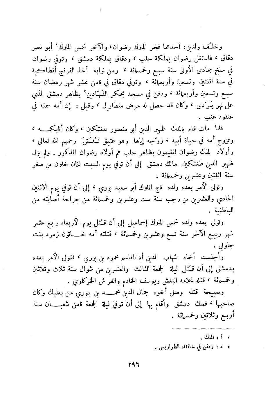 وخلف ولدين: أحدهما فخر الملوك رضوان، والآخر شمس الملوك (1) أبو نصر دقاق، فاستقل رضوان بمملكة حلب، ودقاق بمملكة دمشق، وتوفي رضوان في سلخ جمادى الأولى سنة سبع وخمسمائة، ومن نوابه أخذ الفرنج أنطاكية في سنة اثنتين وتسعين وأربعمائة، وتوفي دقاق في ثامن عشر شهر رمضان سنة سبع وتسعين وأربعمائة، ودفن في مسجد بحكر الفهادين (2) بظاهر دمشق الذي على نهر بردى، وكان قد حصل له مرض متطاول، وقيل: إن أمه سمته في عنقود عنب.