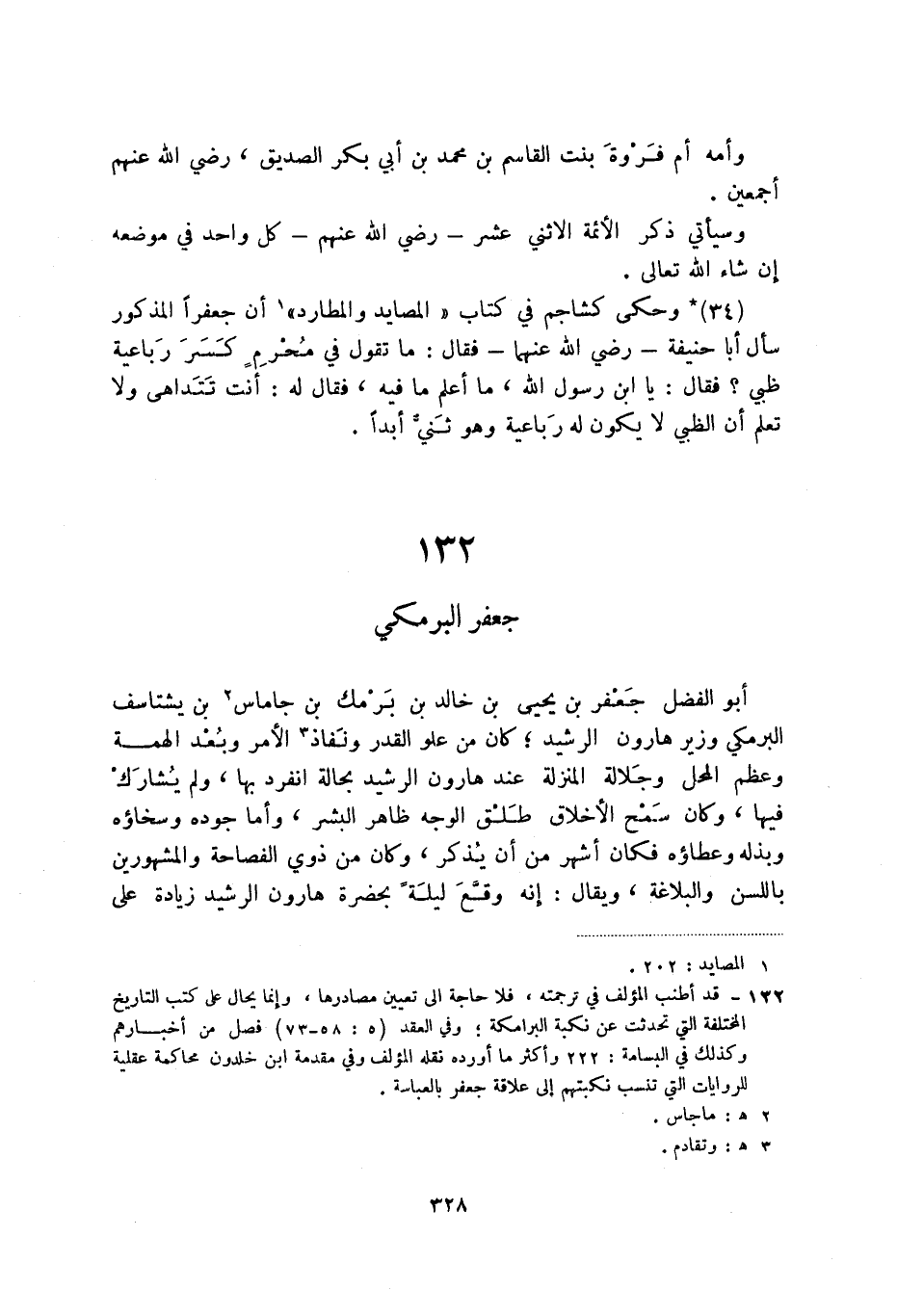 (2) قد أطنب المؤلف في ترجمته، فلا حاجة إلى تعيين مصادرها، وإنما يحال على كتب التاريخ المختلفة التي تحدثت عن نكبة البرامكة؛ وفي العقد (5: 58 - 73) فصل من أخبارهم وكذلك في البسامة: 222 وأكثر ما أورده نقله المؤلف وفي مقدمة ابن خلدون محاكمة عقلية للروايات التي تنسب نكبتهم إلى علاقة جعفر بالعباسة.