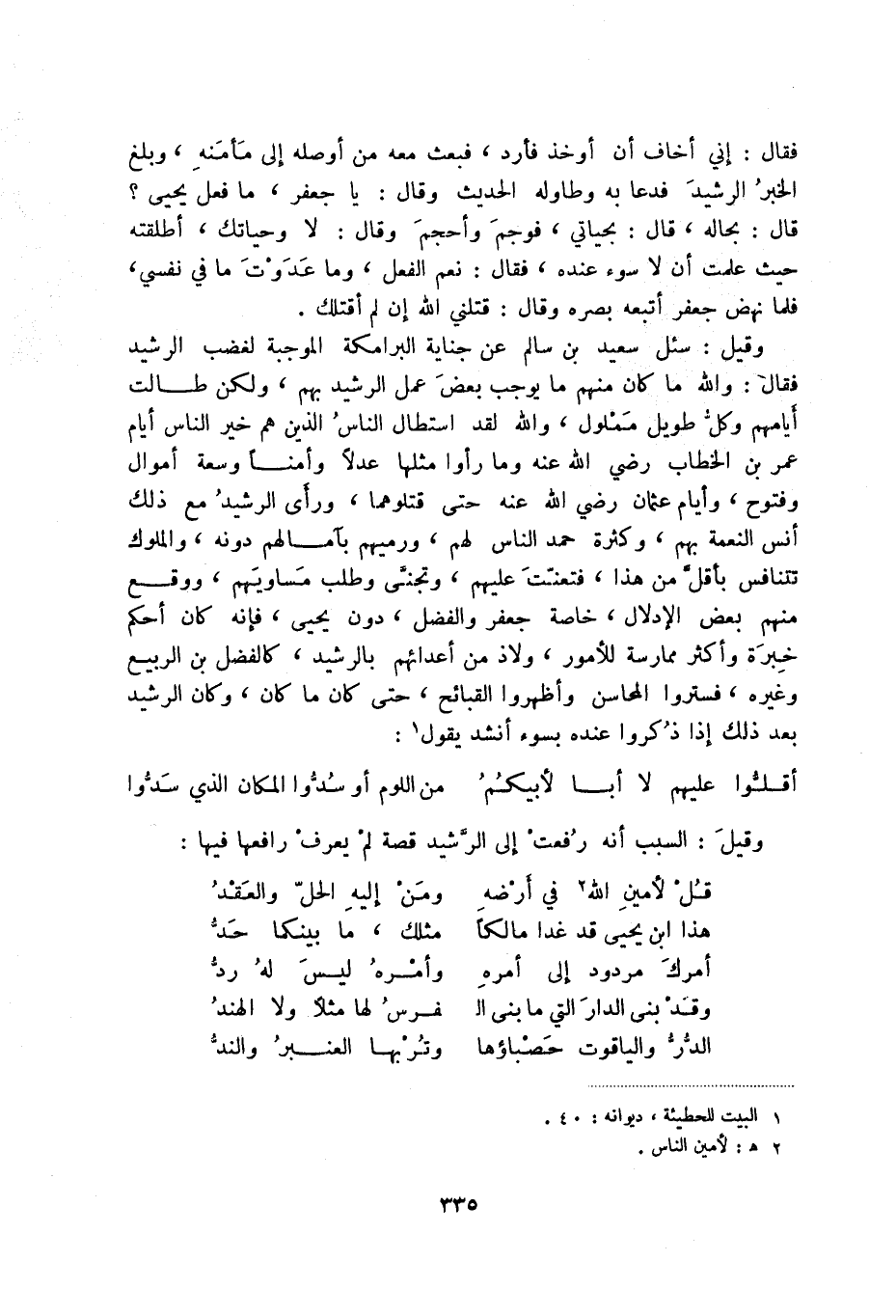 وقيل: سئل سعيد بن سالم عن جناية البرامكة الموجبة لغضب الرشيد فقال: والله ما كان منهم ما يوجب بعض علم الرشيد بهم، ولكن طالت أيامهم وكل طويل مملول، والله لقد استطال الناس الذين هم خير الناس أيام عمر بن الخطاب رضي الله عنه وما رأوا مثلها عدلاً وأمنا وسعة أموال وفتوح، وأيام عثمان رضى الله عنه حتى قتلوهما، ورأى الرشيد مع ذلك أنس النعمة بهم، وكثرة حمد الناس لهم، ورميهم بآمالهم دونه، والملوك تتنافس بأقل من هذا، فتعنت عليهم، وتجنى وطلب مساويهم، ووقع منهم بعض الإدلال، خاصة جعفر والفضل، دون يحيى، فإنه كان أحكم خبرة وأكثر ممارسة للأمور، ولاذ من أعدائهم بالرشيد، كالفضل بن الربيع وغيره، فستروا المحاسن وأظهروا القبائح، حتى كان ما كان، وكان الرشيد بعد ذلك إذا ذكروا عنده بسوء أنشد يقول (1) :