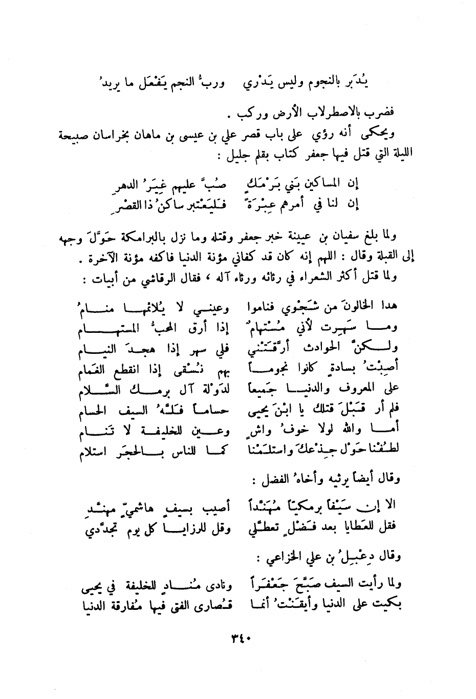 إن لنا في أمرهم عبرة ... فليعتبر ساكن ذا القصر ولما بلغ سفيان بن عيينة خبر جعفر وقتله وما نزل بالبرامكة حول وجهه إلى القبلة وقال: اللهم إنه كان قد كفاني مؤنة الدنيا فاكفه مؤنة الآخرة.