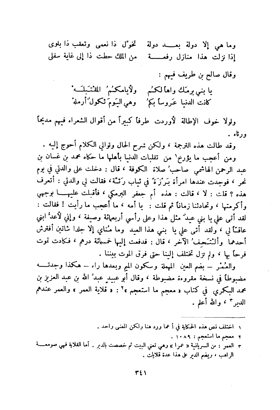 ومن أعجب ما يؤرخ (1) من تقلبات الدنيا بأهلها ما حكاه محمد بن غسان بن عبد الرحمن الهاشمي صاحب صلاة الكوفة، قال: دخلت علىوالدتي في يوم نحر، فوجدت عندها امرأة برزة في ثياب رثة، فقالت لي والدتي: أتعرف هذه قلت: لا، قالت: هذه أم جعفر البرمكي، فأقبلت عليها بوجهي وأكرمتها، وتحادثنا ومانا ثم قلت: يا أمه، ما أعجب ما رأيت! فقالت: لقد أتى علي يا بني عيد مثل هذا وعلى رأسي أربعمائة وصيفة، وإني لأعد ابني عاقاً لي، ولقد أتى علي يا بني هذا العيد وما منأي إلا جلدا شاتين أفترش أحدهما وألتحف الآخر، قال: فدفعت إليها خمسمائة درهم، فكادت تموت فرحاً بها، ولم تزل تختلف إلينا حتى فرق الموت بيننا.