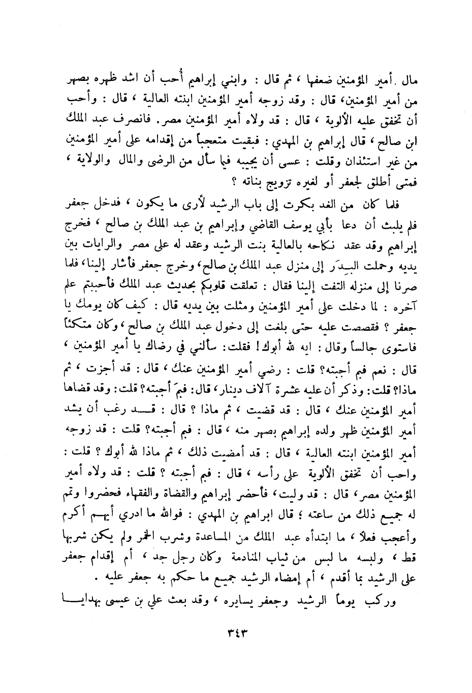 فلما كان من الغد بكرت إلى باب الرشيد لأرى ما يكون، فدخل جعفر فلم يلبث أن دعا بأبي يوسف القاضي وإبراهيم بن عبد الملك بن صالح، فخرج إبراهيم وقد عقد نكاحه بالعالية بنت الرشيد وعقد له على مصر والرايات بين يديه وحملت البدر إلى منزل عبد الملك بن صالح، وخرج جعفر فأشار إلينا، فلما صرنا إلى منزله التفت إلينا فقال: تعلقت قلوبكم بحديث عبد المك فأحببتم علم آخره: لما دخلت على أمير المؤمنين ومثلت بين يديه قال: كيف كان يومك ياجعفر فقصصت عليه حتى بلغت إلى دخول عبد الملك بن صالح، وكان متكئاً فاستوى جالساً وقال: ايه لله أبوك! فقلت: سألني في رضاك يا أمير المؤمنين، قال: نعم فبم أجبته قلت: رضي أمير المؤمنين عنك، قال: قد أجزت، ثم ماذا قلت: وذكر أن عليه عشرة آلاف دينار، قال: فبم أجبته قلت: وقد قضاها أمير المؤمنين عنك، قال: قد قضيت، ثم ماذا قال: قد رغب أن يشد أمير المؤمنين ظهر ولده إبراهيم بصهر منه، قال: فبم أجبته قلت: قد زوجه أمبير المؤمنين ابنته العالية، قال: قد أمضيت ذلك، ثم ماذا لله أبوك قلت: واحب أن تخفق الألوية على رأسه، قال: فبم أجبته قلت: قد ولاه أمير المؤمنين مصر، قال: قد وليت، فأحضر إبراهيم والقضاة والفقهاء فحضروا وتمم له جميع ذلك من ساعته؛ قال إبراهيم بن المهدي: فوالله ما ادري أيهم أكرم وأعجب فعلا، ما ابتدأه عبد الملك من المساعدة وشرب الخمر ولم يكن شربها قط، ولبسه ما لبس من ثياب المنادمة وكان رجل جد، أم إقدام جعفر على الرشيد بما أقدم، وأم إمضاء الرشيد جميع ما حكم به جعفر عليه.