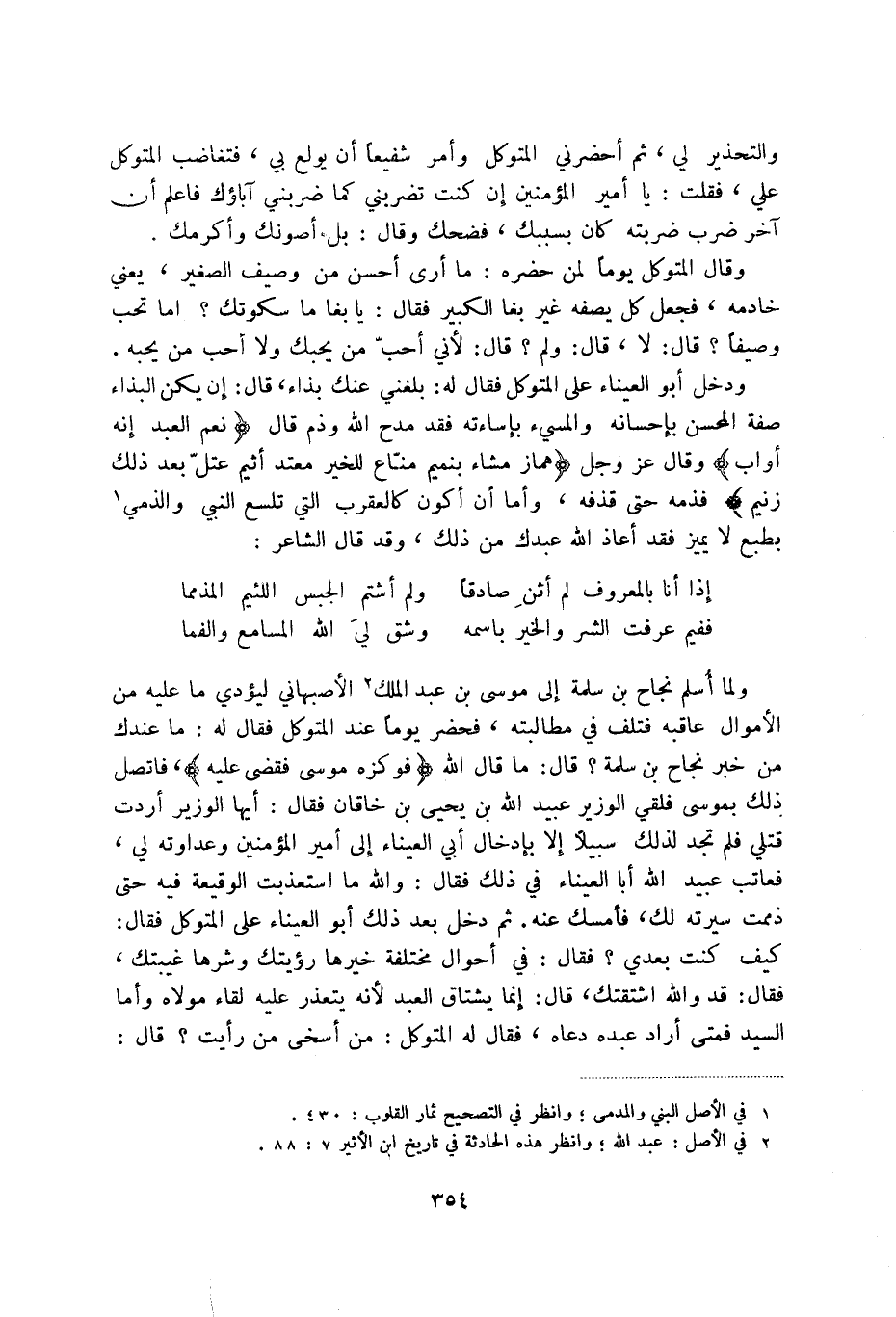 والتحذير لي، ثم أحضرني المتوكل وأمر شفيعا أن يولع بي، فتغاضب المتوكل علي، فقلت: يا أمير المؤمنين إن كنت تضربني كما ضربني آباؤك فاعلم أن آخر ضرب ضربته كان بسببك، فضحك وقال: بل أصونك وأكرمك.
