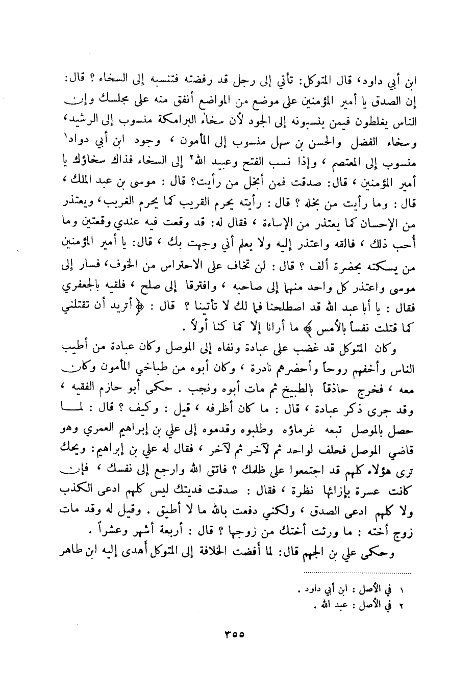 ابن أبي دواد، قال المتوكل: تأتي إلى رجل قد رفضته فتنسبه إلى السخاء قال: إن الصدق يا أمير المؤمنين على موضع من المواضع أنفق منه على مجلسك وإن الناس يغلطون فيمن ينسبونه إلى الجود لأن سخاء البرامكة منسوب إلى الرشد، وسخاء الفضل والحسن بن سهل منسوب إلى المأمون، وجود اب أبي دواد (1) منسوب إلى المعتصم، وإذا نسب الفتح وعبيد الله (2) إلى السخاء فذاك سخاؤك ياأمير المؤمنين، قال: صدقت فمن أبخل من رأيت قال: موسى بن عبد الملك، قال: وما رأيت من بخله قال: رأيته يحرم القريب كما يحرم الغريب، ويعتذر من الإحسان كما يعتذر من الإساءة، فقال له: قد وقعت فيه عندي وقعتين وما أحب ذلك، فالقه واعتذر إليه ولا يعلم أني وجهت بك، قال: يا أمير المؤمنين من يسكته بحضرة ألف قال: لن تخاف على الاحتراس من الخوف، فسار إلى موسى واعتذر كل واحد منهما إلى صاحبه، وافترقا إلى صلح، فلقيه بالجعفري فقال: يا أبا عبد الله قد اصطلحنا فمالك لا تأتينا قال أتريد أن تقتلني كما قتلت نفساً بالأمس ما أرانا إلا كما كنا أولاً.