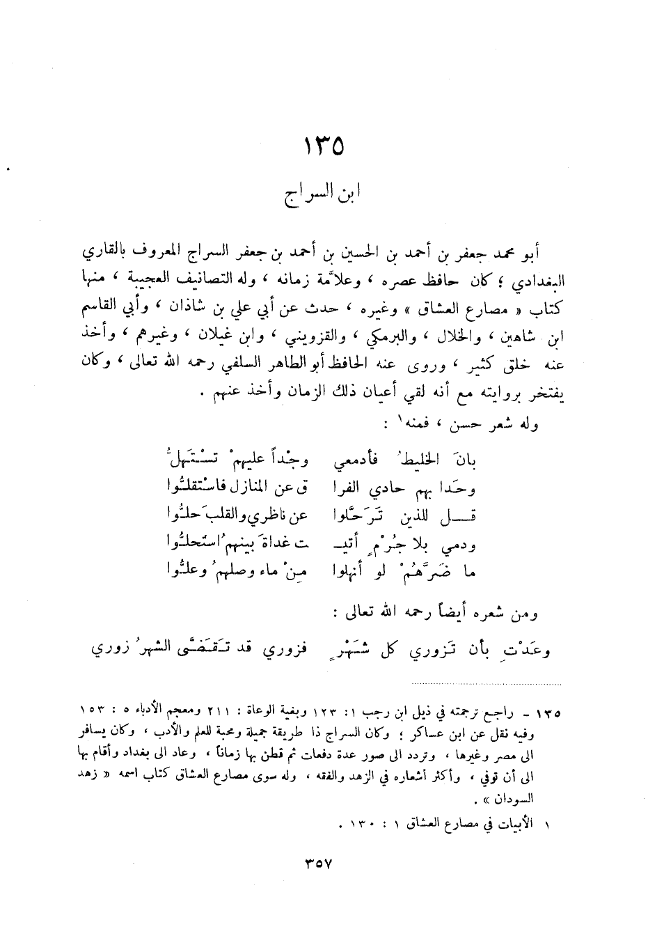 (1) راجع ترجمته في ذيل ابن رجب 1: 123 وبغية الزعاة: 211 ومعجم الأدباء 5: 153 وفيه نقل عن ابن عساكر؛ وكان السراج ذا طريقة جميلة ومحبة للعلم والأدب، وكان يسافر إلى مصر وغيرها، وتردد إلى صور عدة دفعات ثم قطن بها زماناً، وعاد غلى بغداد وأقام بها إلى أن توفي، وأكثر أشعاره في الزهد والفقه، وله سوى مصارع العشاق كتاب اسمه " زهد السودان ".