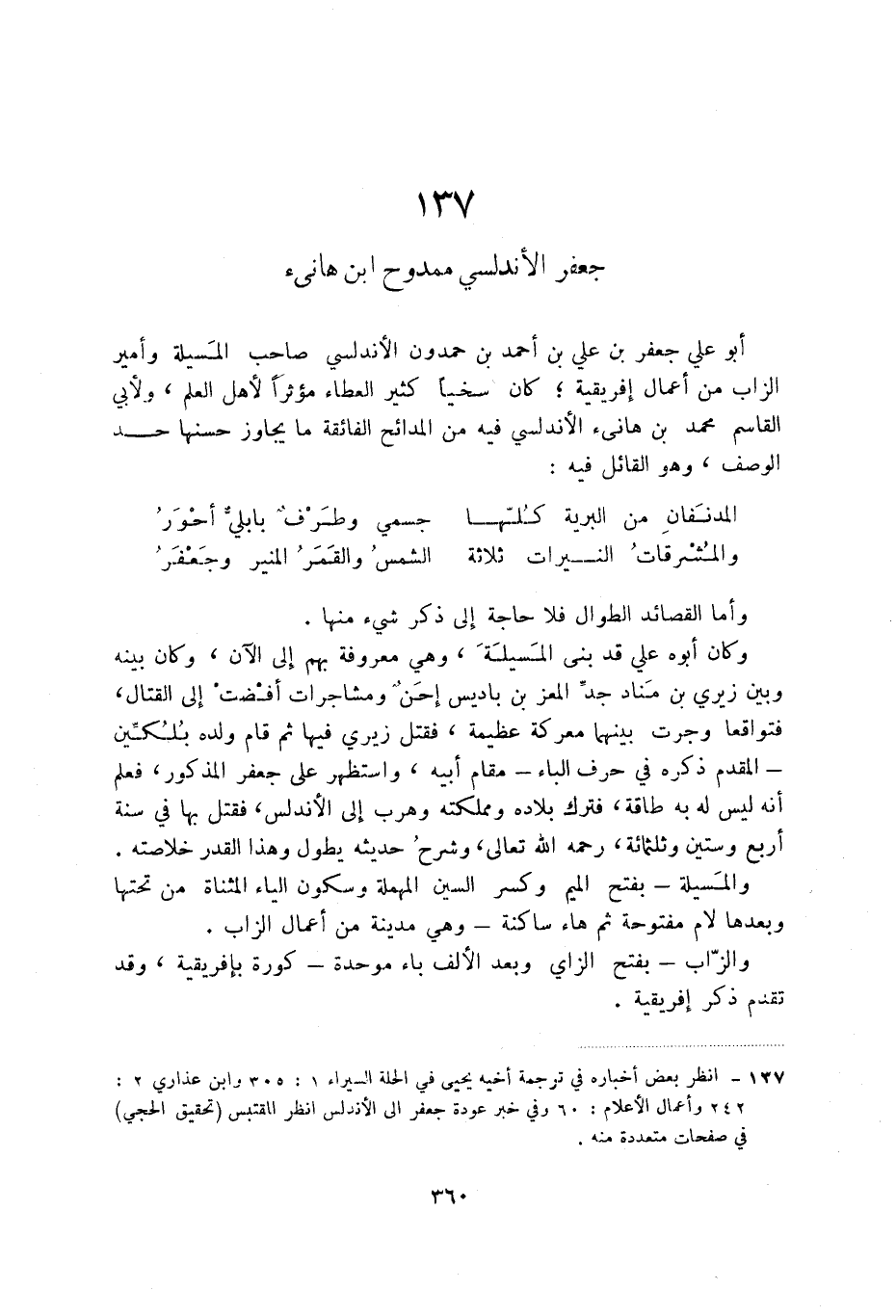 وكان أبوه علي قد بنى المسيلة، وهي معروفة بهم إلى الآن، وكان بينه وبين زيري بن مناد جد المعز بن باديس إحن ومشاجرات أفضت إلى القتال، فتواقعا وجرت بينهما معركة عظيمة، فقتل زيري فيها ثم قام ولده بلكين - المقدم ذكره في حرف الباء - مقام أبيه، واستظهر على جعفر المذكور، فعلم أنه ليس له به طاقة، فترك بلاده ومملكته وهر إلى الأندلس، فقتل بها في سنة أربع وستين وثلثمائة، رحمه الله تعالى، وشرح حديثه يطول وهذا القدر خلاصته والمسيلة - بفتح الميم وكسر السين المهملة وسكون الياء المثناة من تحتها وبعدها لام مفتوحة ثم هاء ساكنة - وهي مدينة من أعمال الزاب.