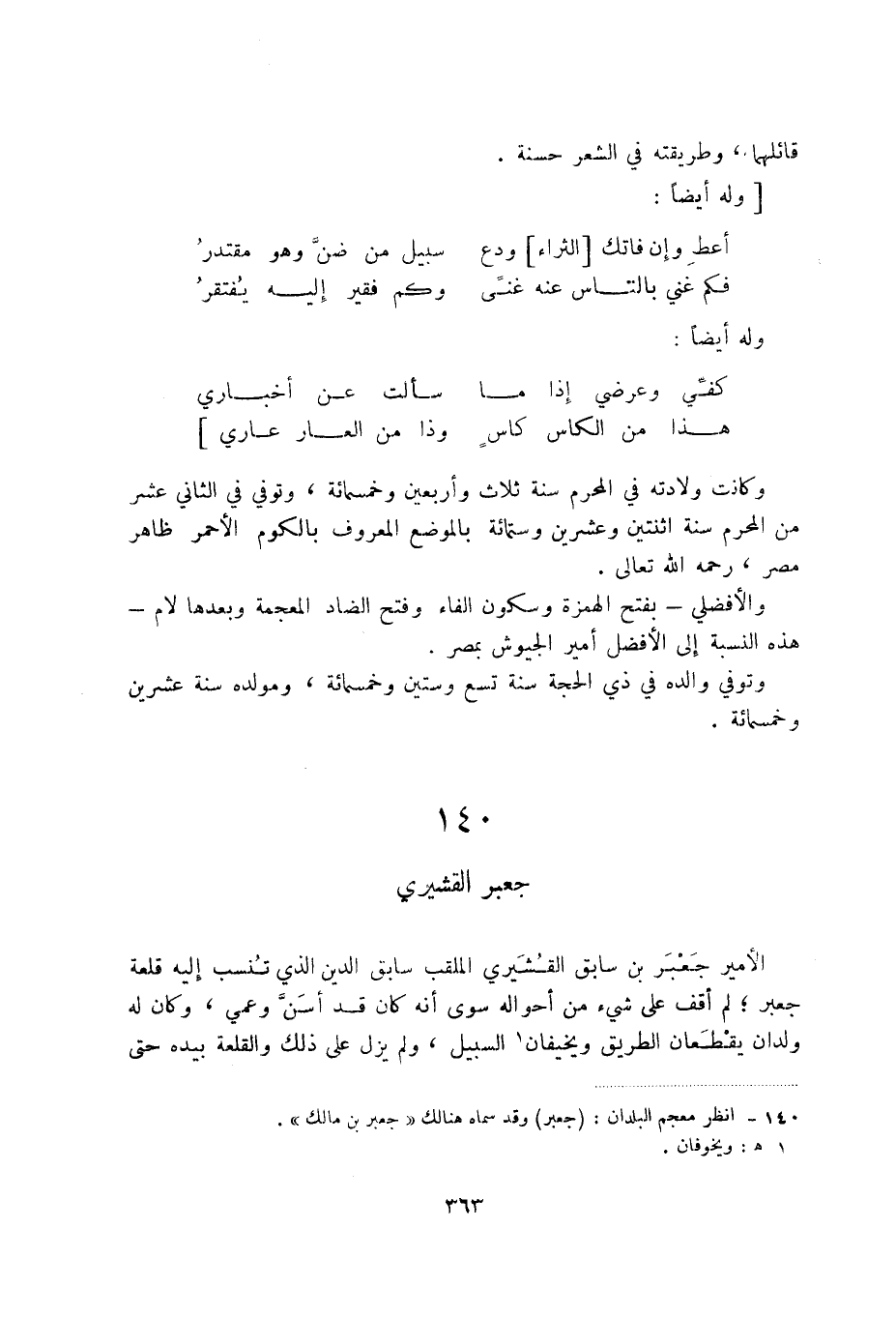 الأمير جعبر بن سابق القشيري الملقب سابق الدين الذي تنسب إليه قلعة جعبر؛ لم أقف على شيء من أحواله سوى أنه كان قد أسن وعمي، وكان له ولدان يقطعان الطريق ويخيفان (2) السبيل، ولم يزل على ذلك والقلعة بيده حتى