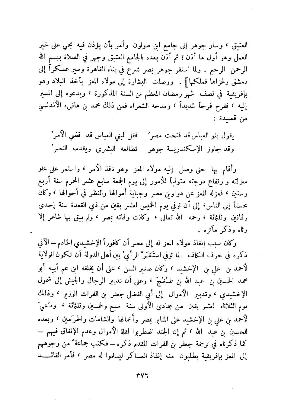 العتيق، وسار جوهر إلى جامع ابن طولون وأمر بأن يؤذن فيه بحي على خير العمل وهو أول ما أذن؛ ثم أذن بعده بالجامع العتيق وجهر في الصلاة ببسم الله الرحمن الرحيم. ولما استقر جوهر بمصر شرع في بناء القاهرة وسير عسكراً إلى دمشق وغزاها فملكها] . ووصلت البشارة إلى مولاه المعز بأخذ البلاد وهو بإفريقية في نصف شهر رمضان المعظم من السنة المذكورة، ويدعوه إلى المسير ليه، ففرح فرحاً شديداً، ومدحه الشعراء فمن ذلك محمد بن هانئ الأندلسي من قصيدة:
