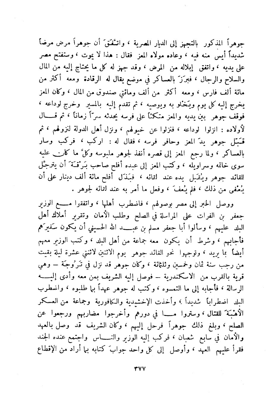 جوهراً المذكور بالتجهز إلى الديار المصرية، واتفق أن جوهرا مرض مرضاً شديداً أيس منه فيه، وعاده مولاه المعز فقال: هذا لا يموت، وستفتح مصر على يديه، واتفق إبلاله من المرض، وقد جهز له كل ما يحتاج إليه من المال والسلاح والرجال، فبرز بالعساكر في موضع يقال له الرقادة ومعه أكثر من مائة ألف فارس، ومعه أكثر من ألف ومائتي صندوق من المال، وكان المعز يخرج إليه كل يوم ويخلو به ويوصيه، ثم تقدم إليه بالمسير وخرج لوداعه، فوقف جوهر بين يديه والمعز مككئاً على فرسه يحدثه سرا زمانا، ثم قال لأولاده: انزلوا لوداعه، فنزلوا عن خيولهم، ونزل أهل الدولة لنزولهم، ثم قبل جوهر يد المعز وحافر فرسه، فقال له: اركب، فركب وسار بالعساكر، ولما رجع المعز إلى قصره أنفذ لجوهر ملبوسه وكل ما كان عليه سوى خاتمه وسراويله، وكتب المعز إلى عبده أفلح صاحب برقة أن يترجل للقائد جوهر ويقبل يده عند لقائه، فبذل أفلح مائة ألف دينار على أن يعفى من ذلك، فلم يعف، وفعل ما أمر به عند لقائه لجوهر.