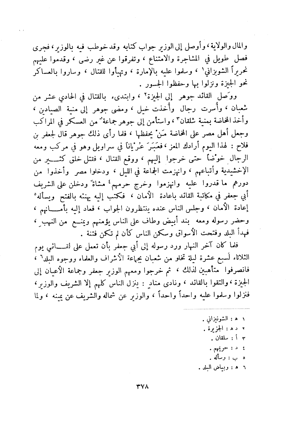 ووصل القائد جوهر إلى الجيزة (2) ، وابتدئ بالقتال في الحادي عشر من شعبان، وأسرت رجال وأخذت خيل، ومضى جوهر إلى منية الصيادين، وأخذ المخاضة بمنية شلقان (3) ، واستأمن إلى جوهر جماعة من العسكر في المراكب وجعل أهل مصر على المخاضة من يحفظها، فلما رأى ذلك جوهر قال لجعفر بن فلاح: لهذا اليوم أرادك المعز، فعبر عريانا في سراويل وهو في مركب ومعه الرجال خوضا حتى خرجوا إليهم، ووقع القتال، فقتل خلق كثير من الإخشيدية وأتباعهم، وانهزمت الجماعة في الليل، ودخلوا مصر وأخذوا من دورهم ماقدروا عليه وانهزموا وخرج حرمهم (4) مشاة ودخلن على الشريف أبي جعفر في مكاتبة القائد بإعادة الأمان، فكتب إليه يهنئه بالفتح ويسأله (5) إعادة الأمان، وجلس الناس عنده ينتظرون الجواب، فعاد إليه بأمانهم، وحضر رسوله ومعه بند أبيض وطاف على الناس يؤمنهم ويمنع من النهب، فهدأ البلد وفتحت الأسواق وسكن الناس كأن لم تكن فتنة.