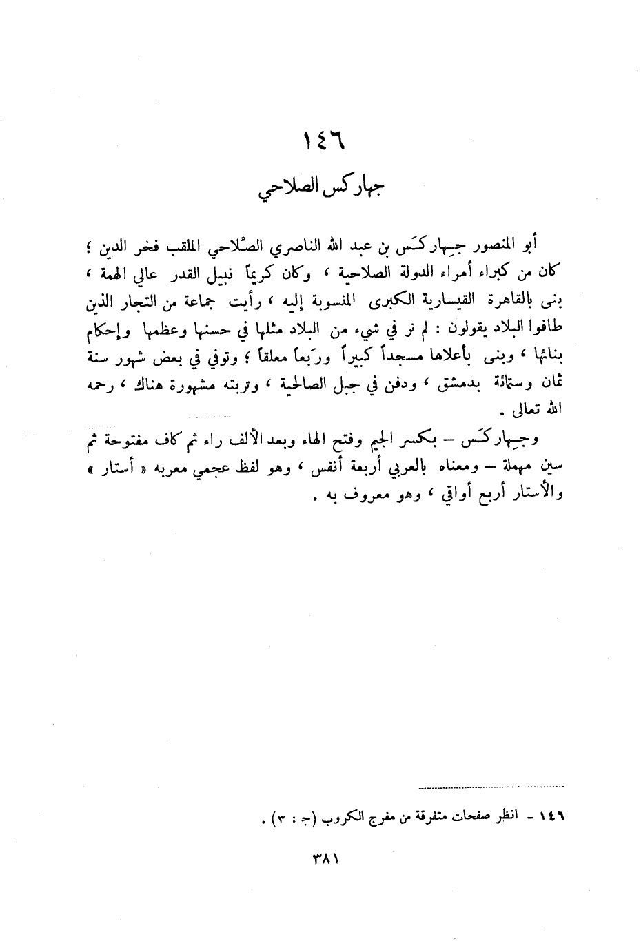 أبو المنصور جهاركس بن عبد الله الناصري الصلاحي الملقب فخر الدين؛ كان من كبراء أمراء الدولة الصلاحية، وكان كريما نبيل القدر عالي الهمة، بنى بالقاهرة القيسارية الكبرى المنسوبة إليه، رأيت جماعة من التجار الذين طافوا البلاد يقولون: لم نر في شيء من البلاد مثلها في حسنها وعظمها وإحكام بنائها، وبنى بأعلاها مسجدا كبيرا وربعا معلقا؛ وتوفي في بعض شهور سنة ثمان وستمائة بدمشق، ودفن في جبل الصالحية، وتربته مشهورة هناك، رحمه الله تعالى.