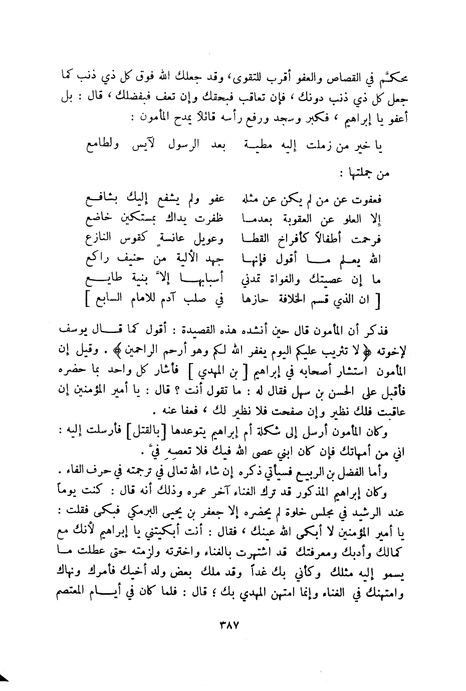 [إن الذي قسم الخلافة حازها ... في صلب آدم للإمام السابع] فذكر أن المأمون قال حين أنشده هذه القصيدة: أقول كما قال يوسف لأخوته (لا تثريب عليكم اليوم يغفر الله لكم وهو أرحم الراحمين) . وقيل إن المأمون استشار أصحابه في إبراهيم [بن المهدي] فأشار كل واحد بما حضره فأقبل على الحسن بن سهل فقال له: ما تقول أنت قال: يا أمير المؤمنين إن عاقبت فلك نظير وإن صفحت فلا نظير لك، فعفا عنه.