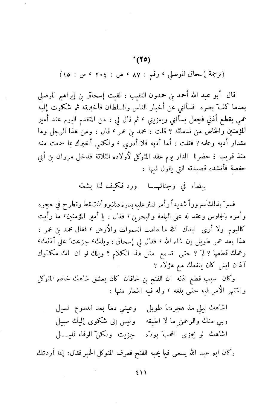 (ترجمة إسحاق الموصلي، رقم: 87، ص: 204، س: 15)