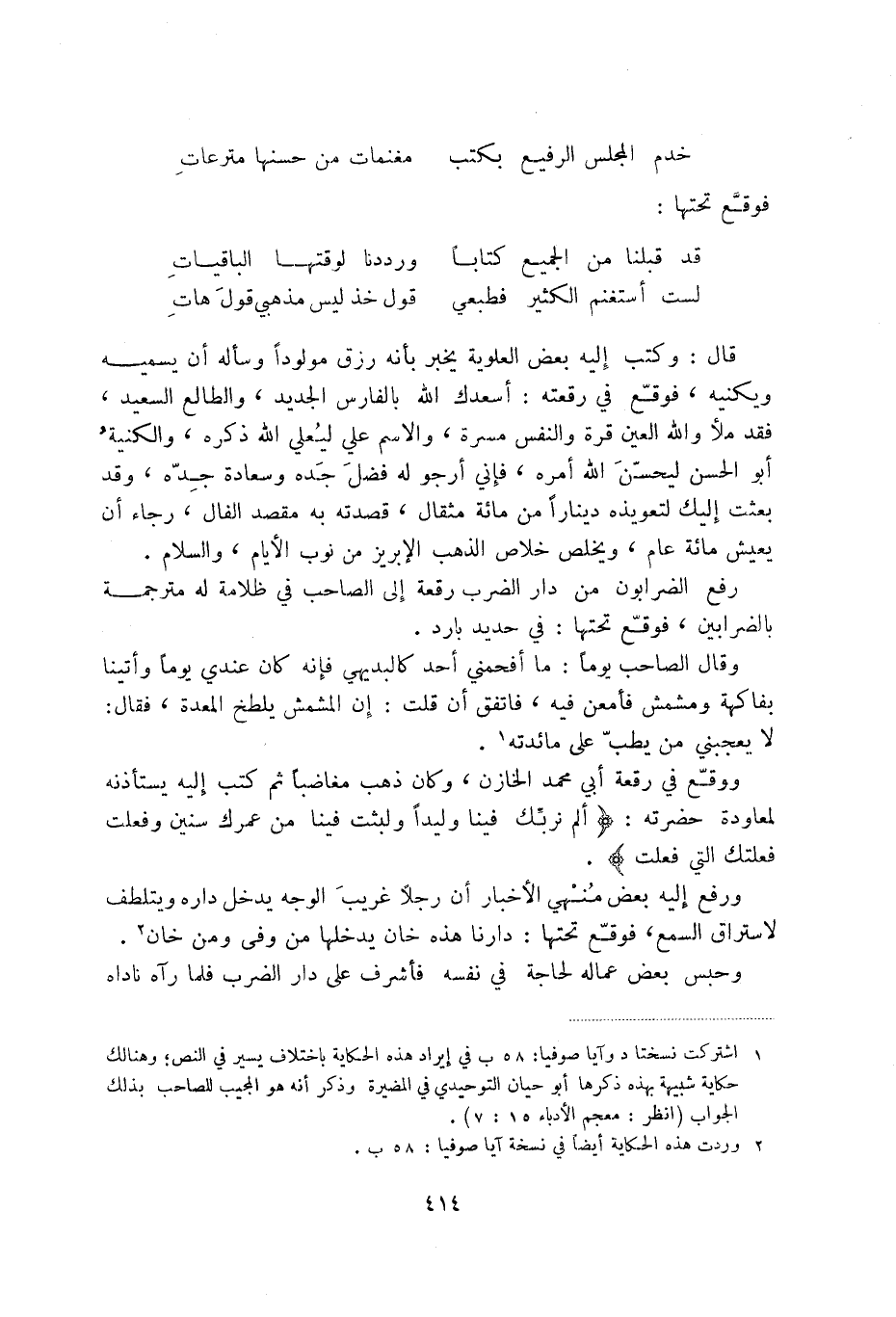 (1) اشتركت نسختا د وآيا صوفيا: 58 ب في إيراد هذه الحكاية باختلاف يسير في النص؛ وهنالك حكاية شبيهة بهذه ذكرها أبو حيان التوحيدي في المضيرة وذكر أنه هو المجيب للصاحب بذلك الجواب (انظر: معجم الأدباء 15: 7) .