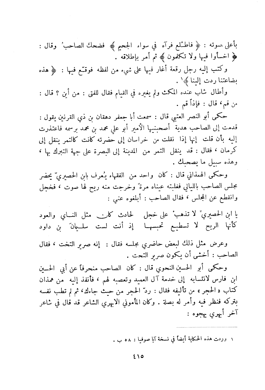 بأعلى صوته: (فاطلع فرآه في سواء الجحيم) فضحك الصاحب وقال: (اخسأوا فيها ولا تكلمون) ثم أمر بإطلاقه.