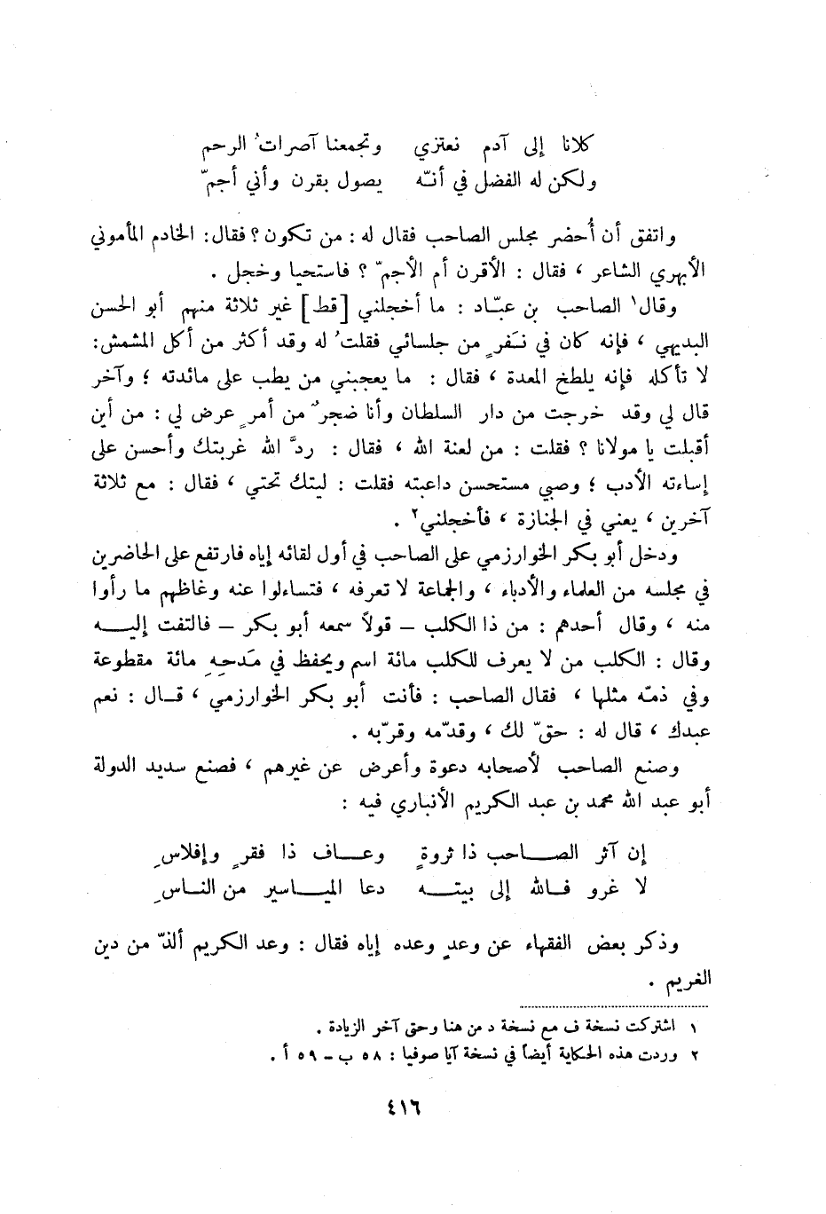 وقال (1) الصاحب بن عباد: ما أخجلني [قط] غير ثلاثة منهم أبو الحسن البديهي، فإنه كان في نفرٍ من جلسائي فقلت له وفد أكثر من أكل المشمش: لا تأكله فإنه يلطخ المعدة، فقال: ما يعجبني من يطب على مائدته؛ وآخر قال لي وقد خرجت من دار السلطان وأنا ضجر من أمرٍ عرض لي: من أين أقبلت يا مولانا فقلت: من لعنة الله، فقال: رد الله غربتك وأحسن على إساءته الأدب؛ وصبي مستحسن داعبته فقلت: ليتك تحتي، فقال: مع ثلاثة آخرين، يعني في الجنازة، فأخجلني (2) .