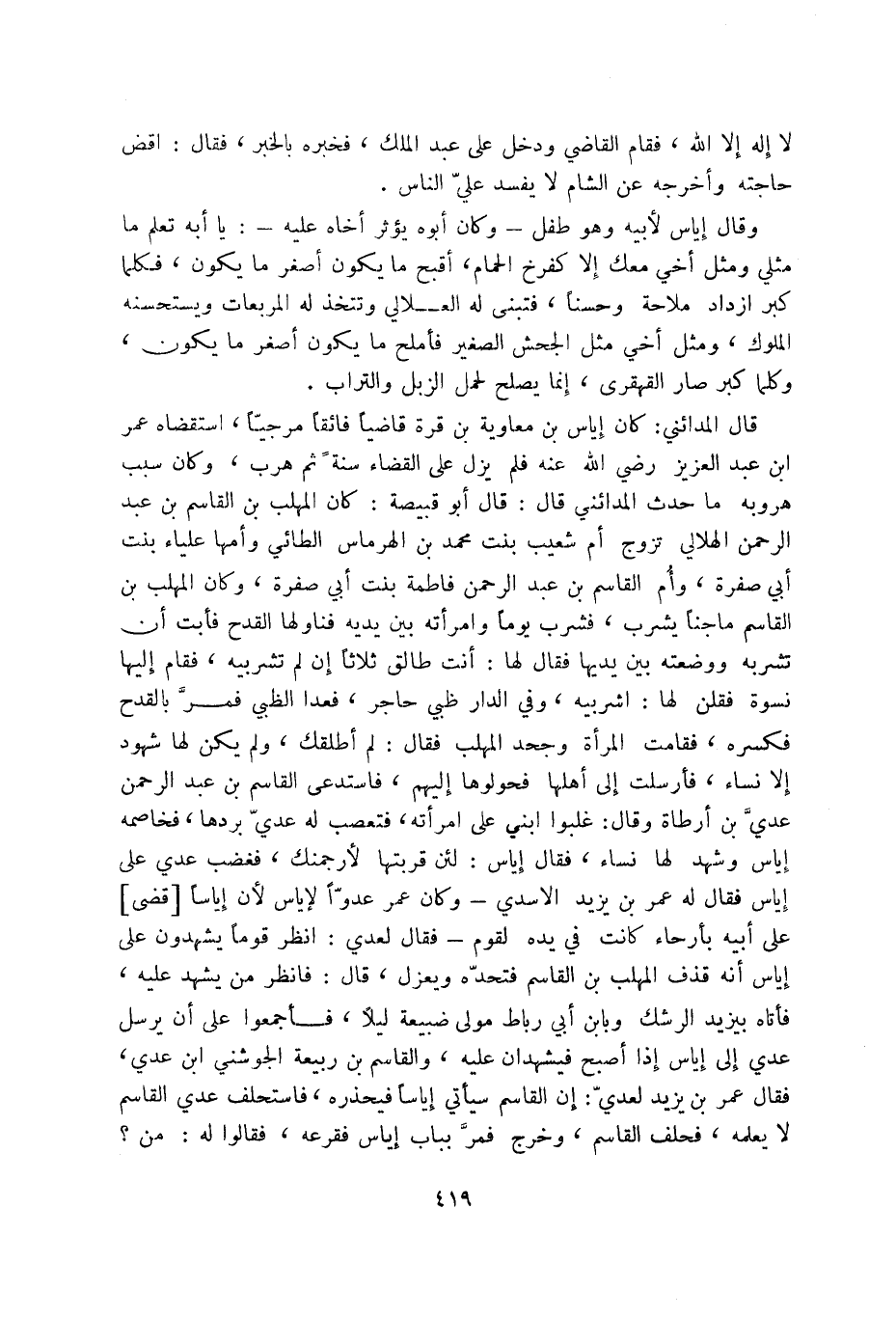 قال المدائني: كان إياس بن معاوية بن قرة قاضياً فائقاً مرجياً، استقضاه عمر ابن عبد العزيز رضي الله عنه فلم يزل على القضاء سنة ثم هرب، وكان سبب هروبه ما حدث المدائني قال: قال أبو قبيصة: كان المهلب بن القاسم بن عبد الرحمن الهلالي تزوج أم شعيب بنت محمد بن الرهامس الطائي وأمها علياء بنت أبي صفرة، وأم القاسم بن عبد الرحمن فاطمة بنت أبي صفرة، وكان المهلب بن القاسم ماجناً يشرب، فشرب يوماً وامرأته بين يديه فناولها القدح فأبت أن تشربه ووضعته بين يديها فقال لها: أنت طالق ثلاثاً إن لم تشربيه، فقام إليها نسوة فقلن لها: اشربيه، وفي الدار ظبي حاجر، فعدا الظبي فمر بالقدح فكسره، فقامت المرأة وجحد المهلب فقال: لم أطلقك، ولم يكن لها شهود إلا نساء، فأرسلت إلى أهلها فحولوها إليهم، فاستدعى القاسم بن عبد الرحمن عدي بن أرطاة وقال: غلبوا بني على امرأته، فتعصب له عدي بردها، فخاصمه إياس وشهد لها نساء، فقال إياس: لئن قربتها لأرجمنك، فغضب عدي على إياس فقال له عمر بن يزيد الأسدي وكان عمر عدواً لإياس لأن إياساً [قضى] على أبيه بأرحاء كانت في يده لقوم فقال لعدي: انظر قوماً يشهدون على إياس أنه قذف المهلب بن القاسم فتحده ويعزل، قال: فانظر من يشهد عليه، فأتاه بيزيد الرشك وبابن أبي رباط مولى ضبيعة ليلاً، فأجمعوا على أن يرسل عدي إلى إياس إذا اصبح فيشهدان عليه، والقاسم بن ربيعة الجوشني ابن عدي، فقال عمر بن يزيد لعدي: إن القاسم سيأتي إياساً فيحذره، فاستحلف عدي القاسم لا يعلمه، فحلف القاسم، وخرج فمر بباب إياس فقرعه، فقالوا له: من