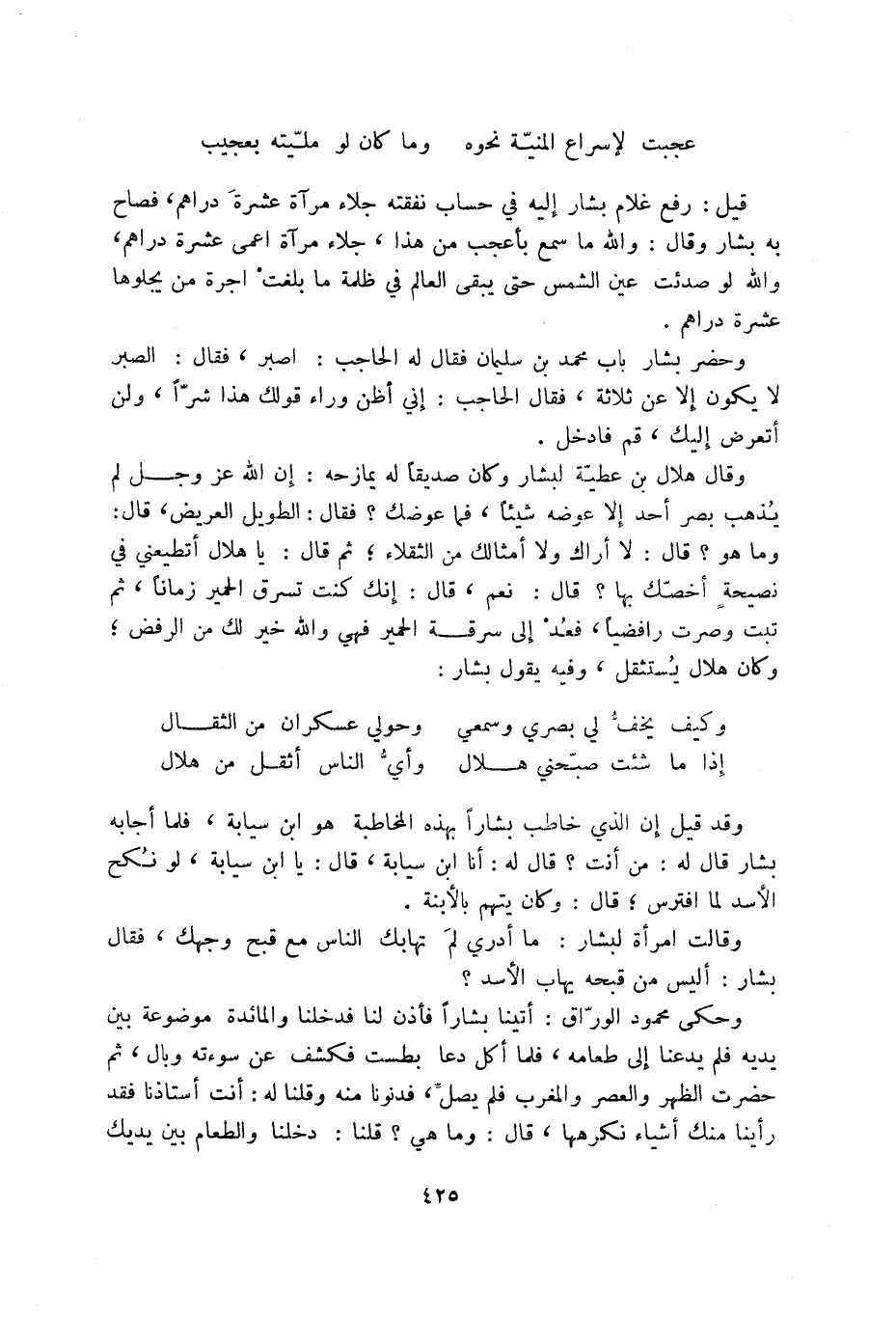 عجبت لإسراع المنية نحوه ... وما كان لو مليته بعجيب قيل: رفع غلام بشار ليه في حساب نفقته جلاء مرآة عشرة دراهم، فصاح به بشار وقال: والله ما سمع بأعجب من هذا، جلاء مرآة أعمى عشرة دراهم، والله لو صدئت عين الشمس حتى يبقى العالم في ظلمة ما بلغت أجرة من يجلوها عشرة دراهم.