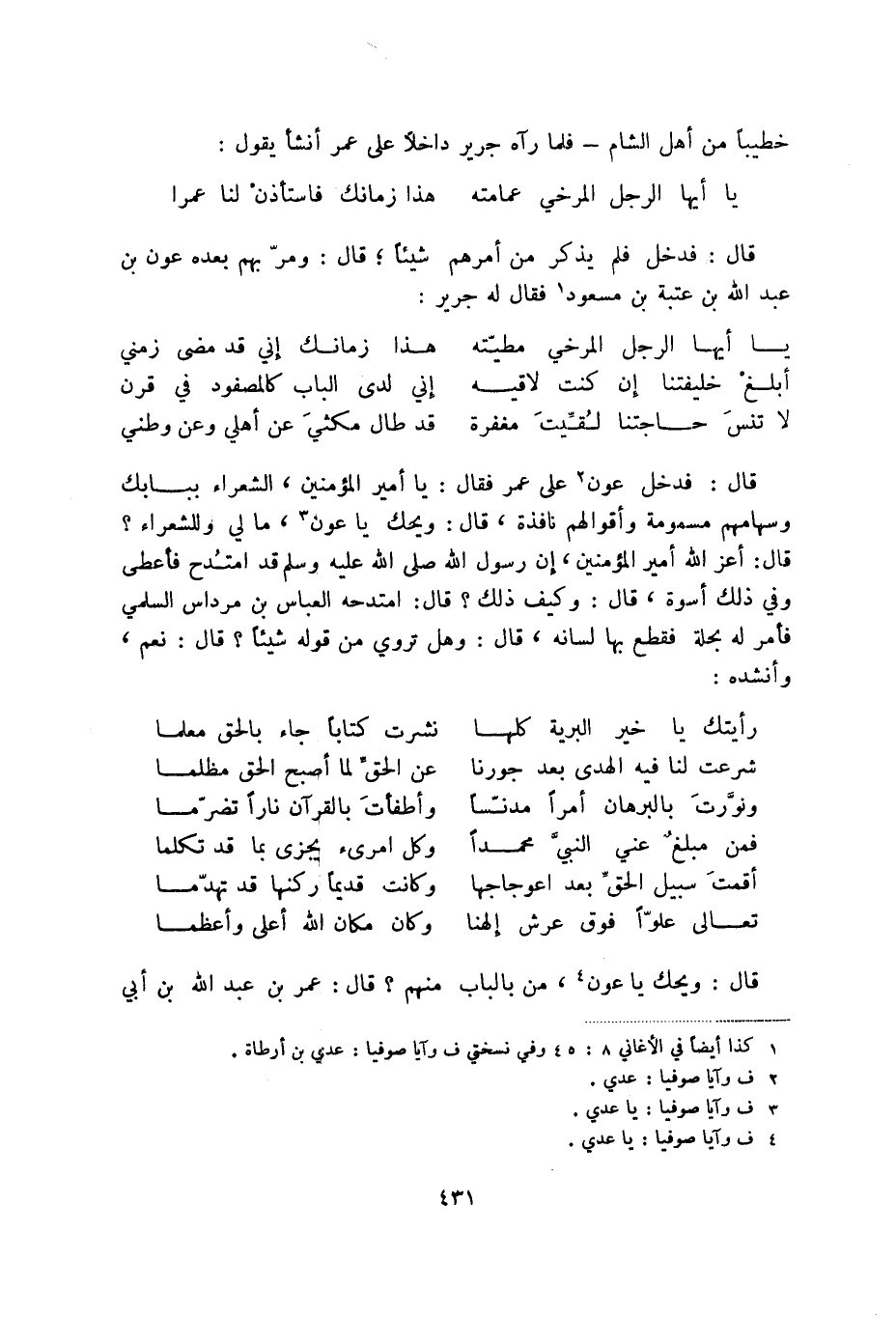 يا أيها الرجل المرخي عمامته ... هذا زمانك فاستأذن لنا عمرا قال: فدخل فلم يذكر من أمرهم شيئاً؛ قال: ومر بهم بعده عون بن عبد الله بن عتبة بن مسعود (1) فقال له جرير: