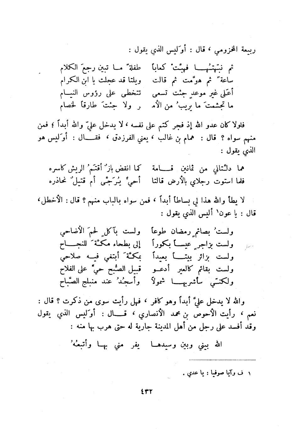 فلما استوت رجلاي بالأرض قالتا ... أحي يرجى أم قتيل نحاذره لا يطأ والله هذا لي بساطاً أبداً، فمن سواه بالباب منهم قال: الأخطل، قال: يا عون (1) أليس الذي يقول: