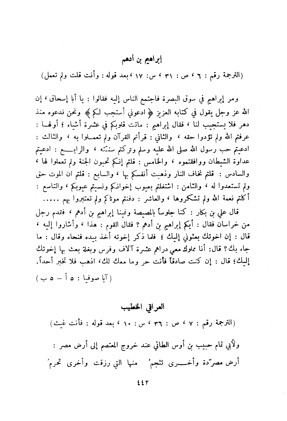 قال علي بن بكار: كنا جلوساً بالمصيصة وفينا إبراهيم بن أدهم، فقدم رجل من خراسان فقال: أيكم إبراهيم بن أدهم فقال القوم: هذا، هذا، وأشاروا إليه، قال: إن اخوتك بعثوني إليك؛ فلما ذكر اخوته أخذ بيده فنحاه وقال: ما جاء بك قال: أنا مملوك معي دراهم عشرة آلاف وفرس وبغلة بعث بها اخوتك إليك؛ قال: إن كنت صادقاً فأنت حر وما معك لك، اذهب فلا تخبر أحداً. (آيا صوفيا: 5 أ 5 ب)