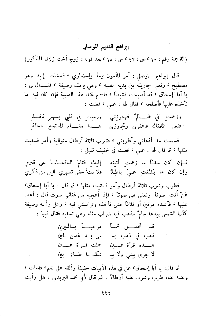 وإن كان ما بلغت عني باطلاً ... فلا مت حتى تسهري الليل من ذكري فطرب وشرب ثلاثة أرطال وأمر فسقيت مثلها، ثم قال: يا أبا إسحاق، عن أنت صوتاً وتغني هي صوتاً، فإذا أعجبه من غنائي صوت قال: أعده عليها، فأعيده مرتين أو ثلاثاً حتى تأخذه وتراسلني فيه، وعلى رأسه وصيفة كأنها الشمس بيدها جام مذهب فيه شراب مثله وهي تسقيه فقال فيها: