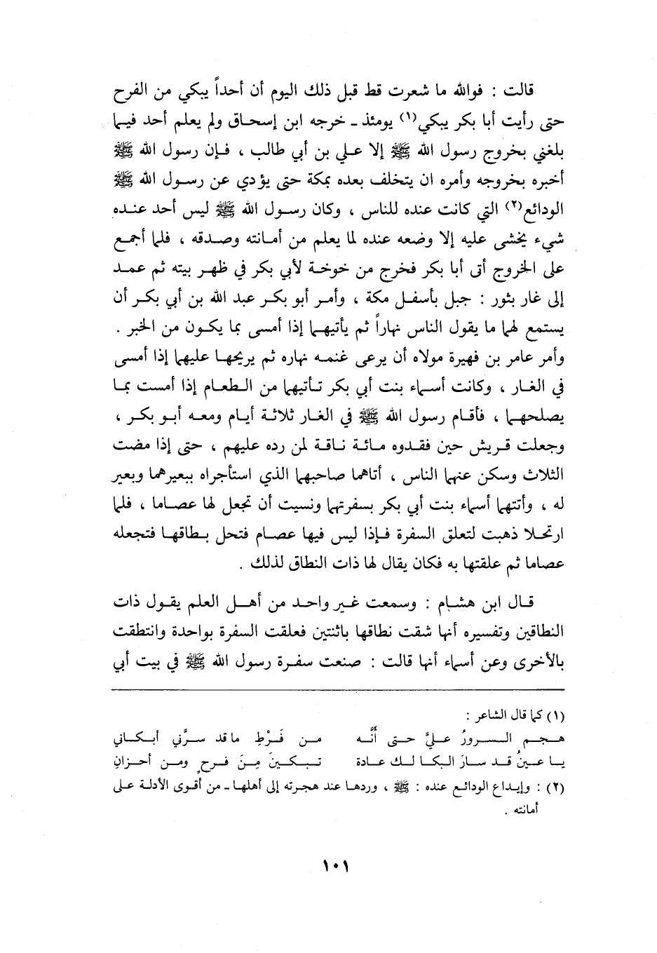 قال ابن هشام: وسمعت غير واحد من أهل العلم يقول ذات النطاقين, وتفسيره أنها شقت نطاقها باثنتين فعلقت السفرة بواحدة وانتطقت بالأخرى. وعن أسماء أنها قالت: صنعت سفرة رسول الله -صلى الله عليه وسلم- في بيت أبي
