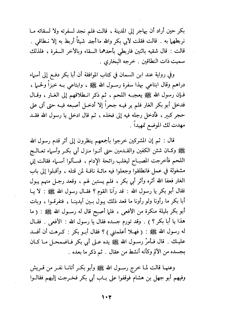 بكر حين أراد أن يهاجر إلى المدينة, قالت: فلم تجد لسفرته ولا لسقائه ما نربطهما به قالت: فقلت لأبي بكر: والله ما أجد شيئًا أربط به إلا نطاقي, قالت: قال: شقيه باثنين فاربطي بأحدهما السقاء وبالآخر السفرة؛ فلذلك سميت ذات النطاقين. خرجه البخاري.