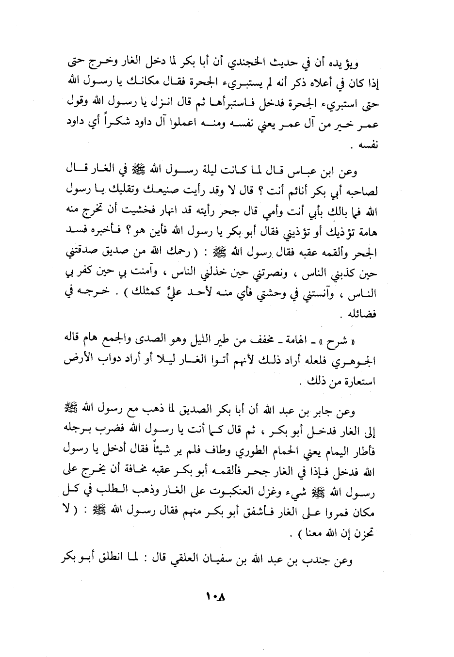 وعن جابر بن عبد الله أن أبا بكر الصديق لما ذهب مع رسول الله -صلى الله عليه وسلم- إلى الغار فدخل أبو بكر ثم قال: كما أنت يا رسول الله, فضرب برجله فأطار اليمام يعني الحمام الطوري وطاف فلم ير شيئًا فقال: ادخل يا رسول الله, فدخل فإذا في الغار جحر فألقمه أبو بكر عقبه مخافة أن يخرج على رسول الله -صلى الله عليه وسلم- شيء, وغزل العنكبوت على الغار وذهب الطلب في كل مكان فمروا على الغار فأشفق أبو بكر منهم فقال له رسول الله -صلى الله عليه وسلم: "لا تحزن إن الله معنا".