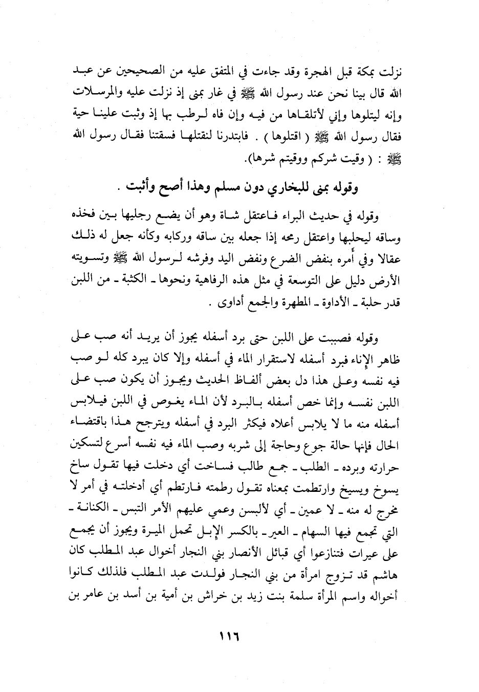 وقوله فصببت على اللبن حتى برد أسفله يجوز أن يريد أنه صب على ظاهر الإناء فبرد أسفله لاستقرار الماء في أسفله وإلا فكان يبرد كله لو صب فيه نفسه وعلى هذا دل بعض ألفاظ الحديث ويجوز أن يكون صب على اللبن نفسه وإنما خص أسفله بالبرد لأن الماء يغوص في اللبن فيلابس أسفله منه لما لا يلابس أعلاه فيكثر البرد في أسفله ويترجح هذا باقتضاء الحال فإنها حالة جوع وحاجة إلى شربه وصب الماء فيه نفسه أسرع لتسكين حرارته وبرده الطب جمع طالب فساخت أي دخلت فيها تقول ساخ يسوخ ويسيخ وارتطمت بمعناه تقول رطمته فارتطم أي أدخلته في أمر لا مخرج له منه لا عمين أي لألبسن وعمي عليهم الأمر التبس -الكنانة- التي تجمع فيها السهام -العير- بالكسر الإبل تحمل الميرة ويجوز أن يجمع على عيرات فتنازعوا أي قبائل الأنصار بني النجار أخوال عبد المطلب كان هاشم تزوج امرأة من بني النجار فولدت عبد المطلب فلذلك كانوا أخواله واسم المرأة سلمة بنت زيد بن خراش بن أمية بن أسد بن عامر بن
