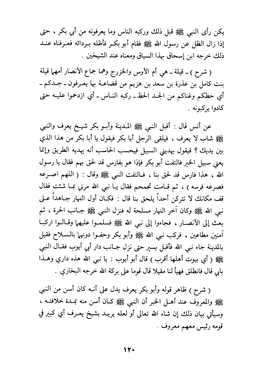 "شرح" ظاهر قوله وأبو بكر شيخ يعرف يدل على أنه كان أسن من النبي -صلى الله عليه وسلم- والمعروف عند أهل الخبر أن النبي -صلى الله عليه وسلم- أسن منه بمدة خلافته وسيأتي بيان ذلك إن شاء تعالى أو لعله يريد بشيخ يعرف أي كبير في قومه رئيس معهم معروف.