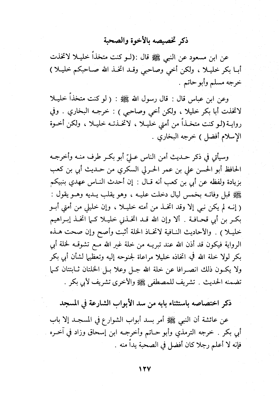 وسيأتي في ذكر حديث أمن الناس علي أبو بكر طرف منه وأخرجه الحافظ أبو الحسن علي ابن عمر الحرلي السكري من حديث أبي بن كعب بزيادة ولفظه عن أبي بن كعب أنه قال: إن أحدث عهدي بنبيكم -صلى الله عليه وسلم- قبل وفاته بخمس ليال دخلت عليه وهو يقلب يديه وهو يقول إنه لم يكن نبي إلا وقد اتخذ من أمته خليلًا وإن خليلي من أمتي أبو بكر بن أبي قحافة ألا وإن الله قد اتخذني خليلًا كما اتخذ إبراهيم خليلًا والأحاديث النافية لاتخاذ الخلة أثبت وأصح وإن صحت هذه الرواية فيكون قد أذن الله له عند تبريه من خلة غير الله مع تشوقه لخلة أبي بكر لولا خلة الله في اتخاذه خليلًا مراعاة لجنوحه إليه وتعظيمًا لشأن أبي بكر ولا يكون ذلك انصرافًا عن خلة الله جل وعلا بل الخلتان ثابتتان كما تضمنه الحديث تشريف للمصطفى -صلى الله عليه وسلم- والأخرى تشريف لأبي بكر.