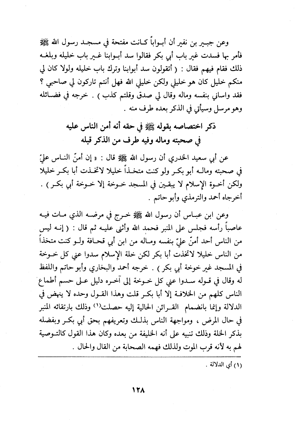 وعن جبير بن نفير أن أبوابًا كانت مفتحة في مسجد رسول الله -صلى الله عليه وسلم- فأمر بها فسدت غير باب أبي بكر فقالوا: سد أبوابنا غير باب خليله وبلغه ذلك فقام فيهم فقال: أتقولون سد أبوابنا وترك باب خليله ولولا كان لي منكم خليل كان هو خليلي ولكن خليلي الله فهلا أنتم تاركون لي صاحبي؟ فقد واساني بنفسه وماله وقال: لي صدق وقلتم كذب خرجه في فضائله وهو مرسل وسيأتي في الذكر بعده طرف منه.