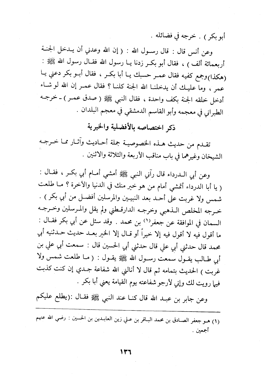 وعن أبي الدرداء قال: رآني النبي -صلى الله عليه وسلم- أمشي أمام أبي بكر فقال: "يا أبا الدرداء أتمشي أمام من هو خير منك في الدنيا والآخرة؟ ما طلعت شمس ولا غربت على أحد بعد النبيين والمرسلين أفضل من أبي بكر". خرجه المخلص الذهبي وخرجه الدارقطني ولم يقل والمرسلين. وخرجه ابن السمان في الموافقة عن جعفر1 بن محمد وقد سئل عن أبي بكر فقال: ما أقوله فيه لا أقول فيه إلا خيرًا أو قال: إلا الخير بعد حديث حدثنيه أبي محمد قال: حدثني أبي علي قال: حدثني أبي الحسين قال: سمعت أبي علي بن أبي طالب يقول سمعت رسول الله -صلى الله عليه وسلم- يقول "ما طلعت شمس ولا غربت" الحديث بتمامه ثم قال: لا أنالني الله شفاعة جدي إن كنت كذبت فيما رويت لك وإني لأرجو شفاعته يوم القيامة يعني أبا بكر.