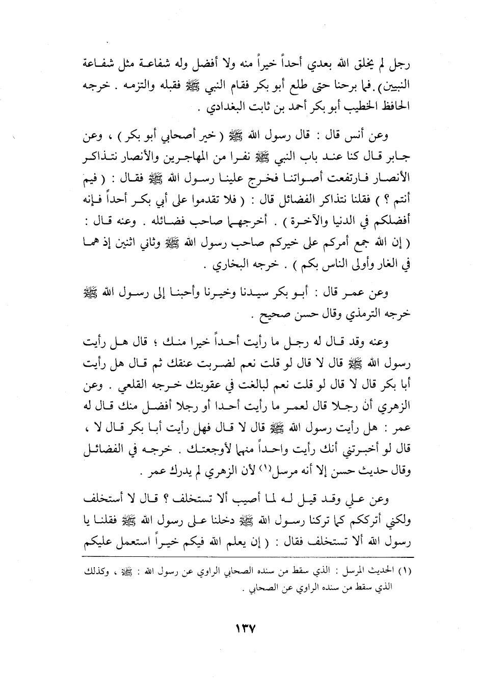 رجل لم يخلق الله بعدي أحدًا خيرًا منه ولا أفضل, وله شفاعة مثل شفاعة النبيين" فما برحنا حتى طلع أبو بكر فقام النبي -صلى الله عليه وسلم- فقبله والتزمه. خرجه الحافظ الخطيب أبو بكر أحمد بن ثابت البغدادي.