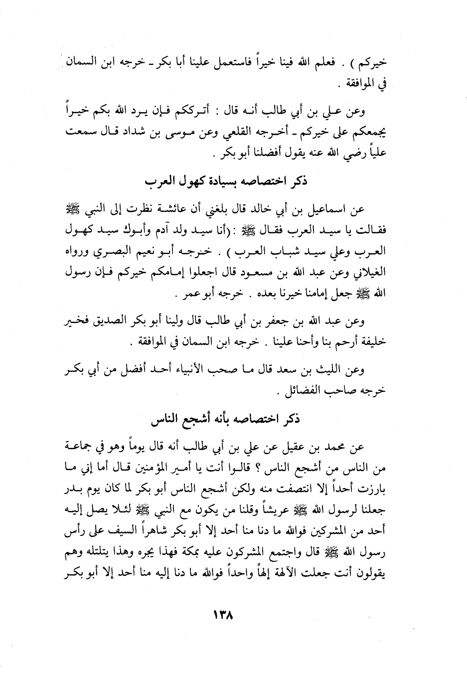 عن إسماعيل بن أبي خالد قال: بلغني أن عائشة نظرت إلى النبي -صلى الله عليه وسلم- فقالت: يا سيد العرب فقال صلى الله عليه وسلم: "أنا سيد ولد آدم, وأبوك سيد كهول العرب, وعلي سيد شباب العرب" خرجه أبو نعيم البصري ورواه الغيلاني, وعن عبد الله بن مسعود قال: اجعلوا إمامكم خيركم, فإن رسول الله -صلى الله عليه وسلم- جعل إمامنا خيرنا بعده. خرجه أبو عمر.